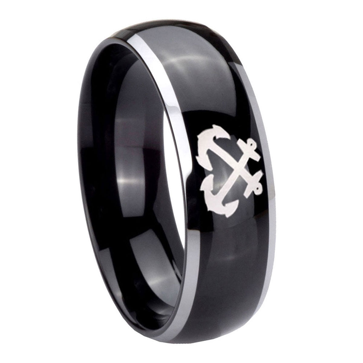 Personalize the 10mm Anchor Dome Glossy Black 2 Tone Tungsten Carbide Mens Ring Engraved. This glossy black and 2-tone dome ring with anchor accents is ideal for engravings.