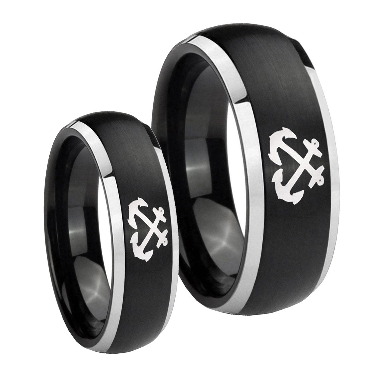 Bride and Groom Anchor Dome Brushed Black 2 Tone Tungsten Men's Band Ring Set