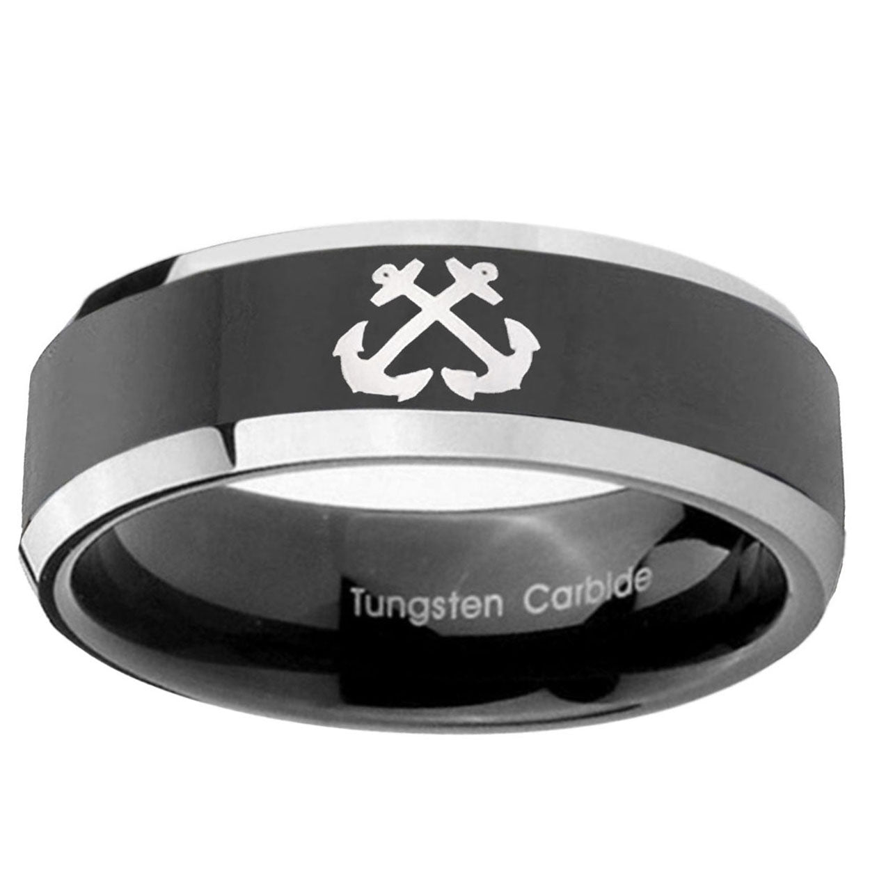 Celebrate with the 10mm Anchor Beveled Edges Glossy Black 2 Tone Tungsten Carbide Anniversary Ring. This glossy black and 2-tone ring with anchor accents is ideal for anniversaries.