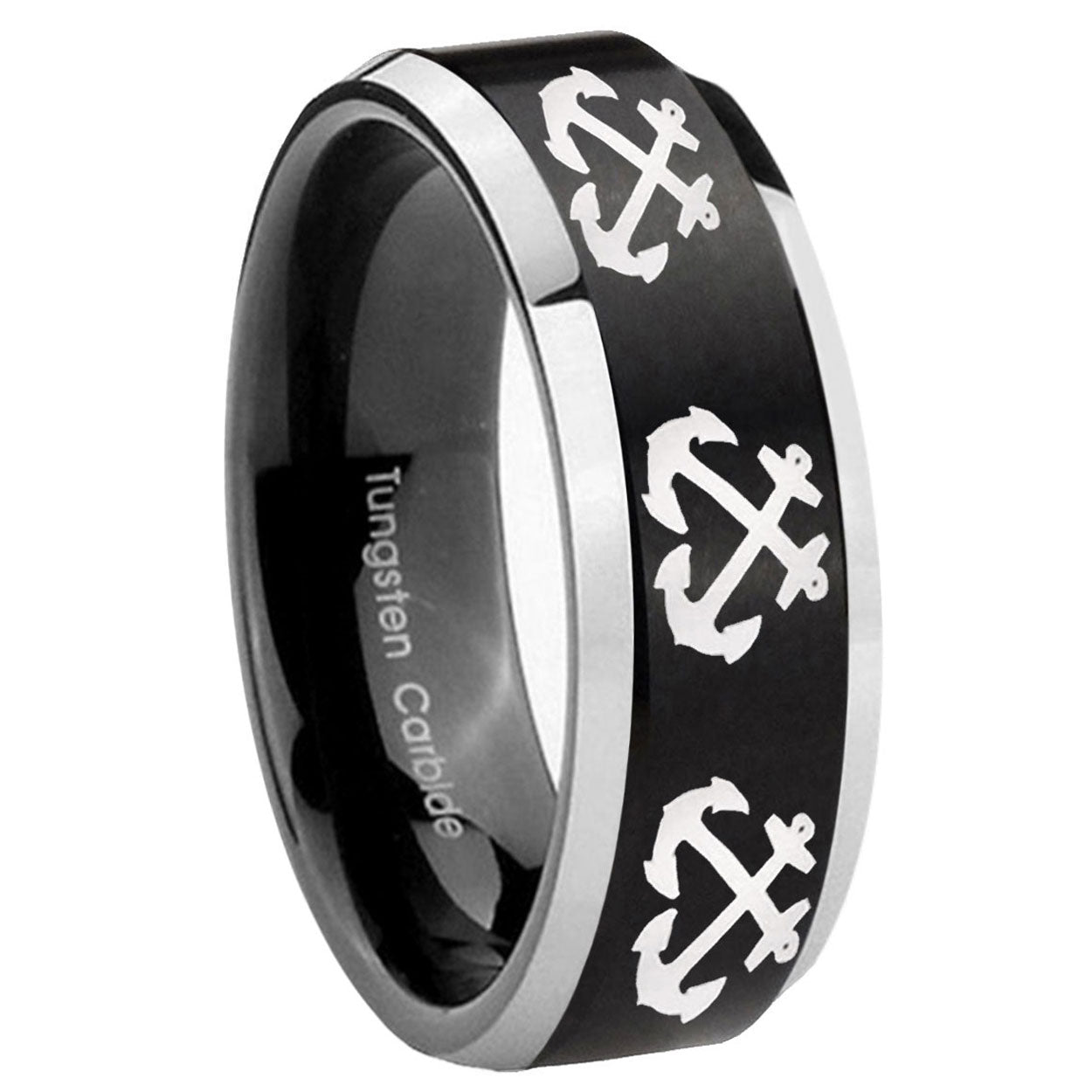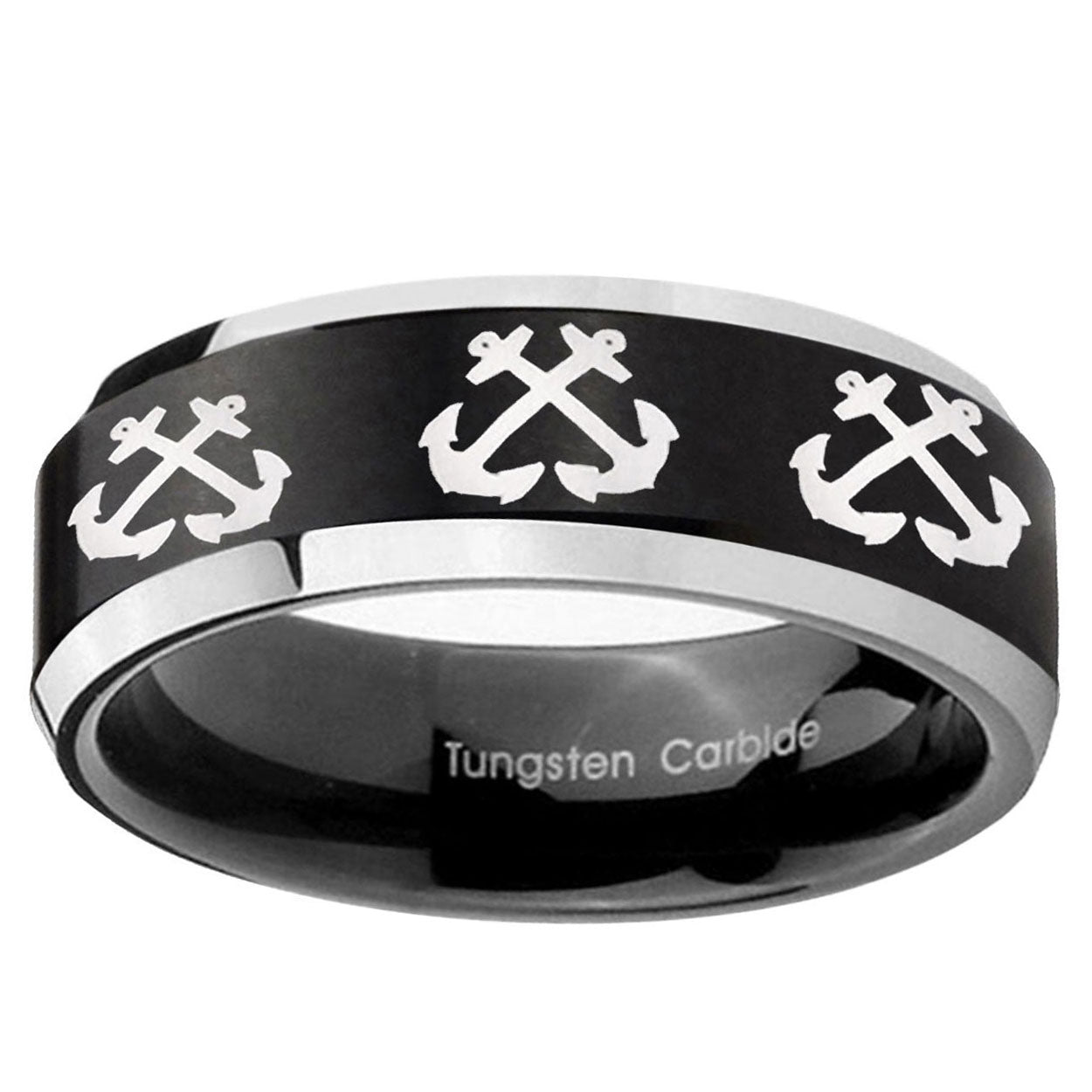 Make a promise with the 10mm Multiple Anchor Beveled Brush Black 2 Tone Tungsten Men's Promise Rings. This brushed black and 2-tone tungsten ring with Multiple Anchor design is ideal for commitments.