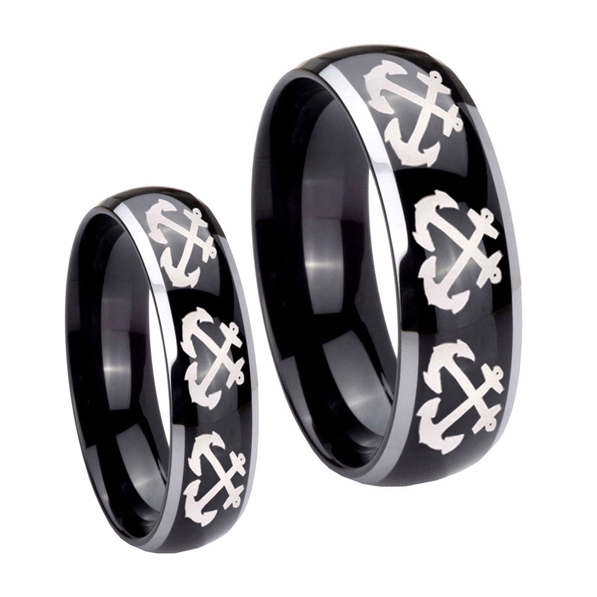 His Hers Multiple Anchor Dome Glossy Black 2 Tone Tungsten Men's Band Ring Set