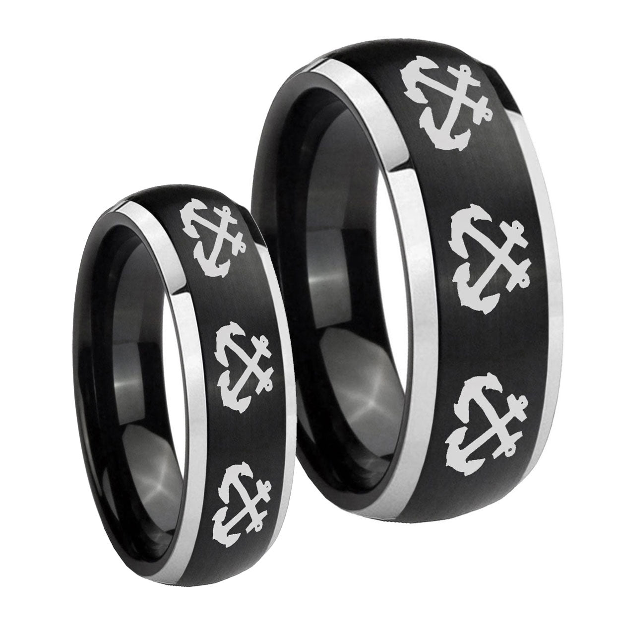 His Hers Multiple Anchor Dome Brushed Black 2 Tone Tungsten Men's Ring Set