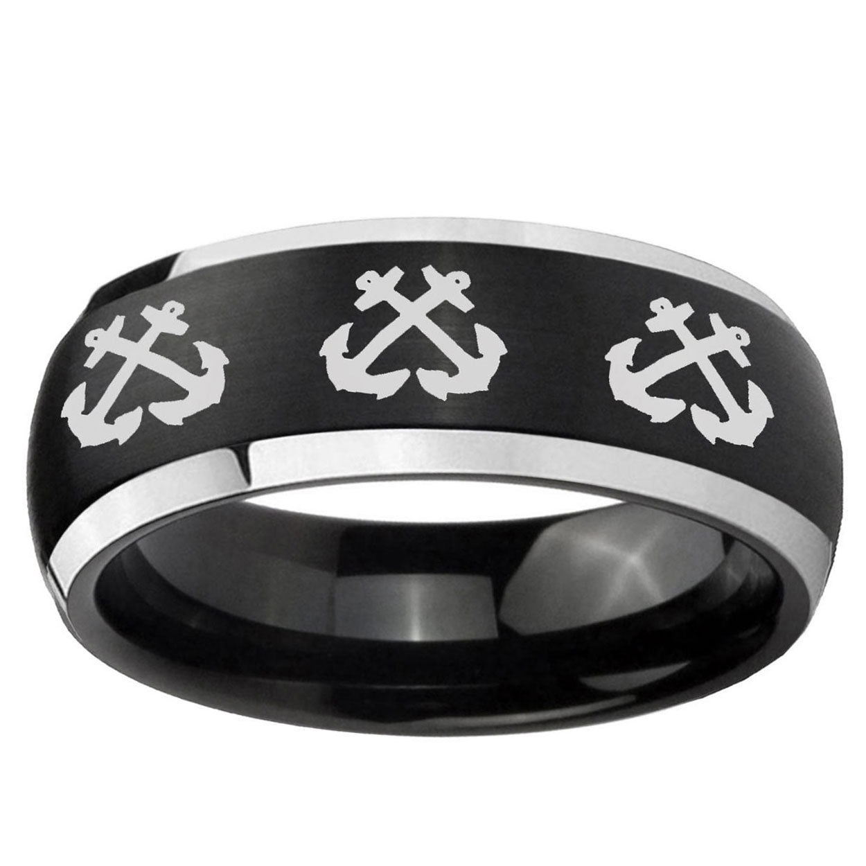 Intruding 5, 8mm Multiple Anchor Dome Brushed Black 2 Tone Tungsten Custom Ring for Men . Offer in both 5mm and 8mm band width brushed black plated finished from size 4 to 14