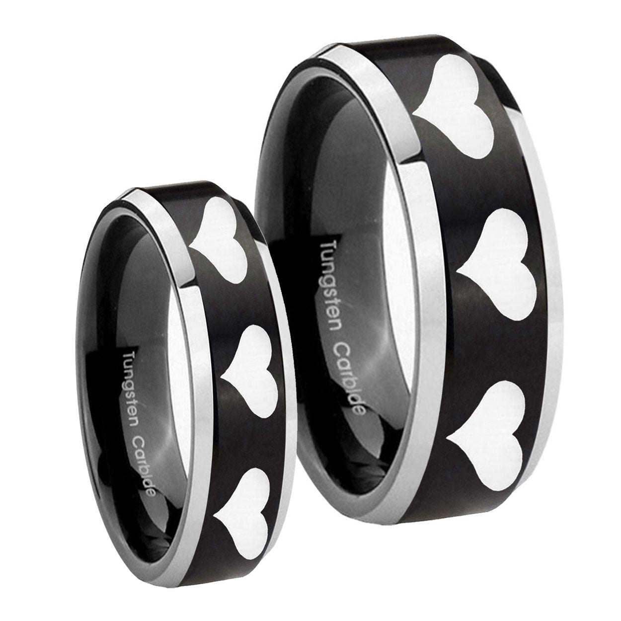 His Hers Multiple Heart Beveled Brush Black 2 Tone Tungsten Men Rings Set