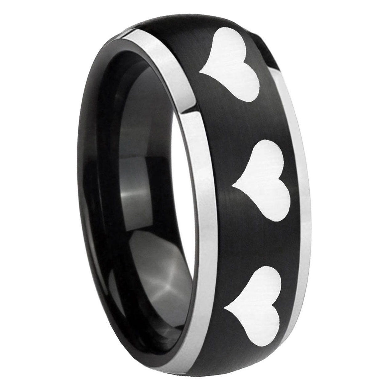 Celebrate with our His And Hers Multiple Heart Beveled Edges Brush Black 2 Tone Tungsten Anniversary Ring, bold and romantic.