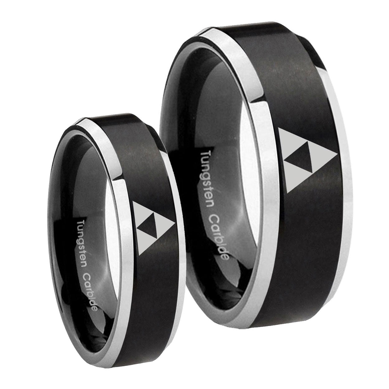 His Hers Zelda Triforce Beveled Brush Black 2 Tone Tungsten Engraved Ring Set