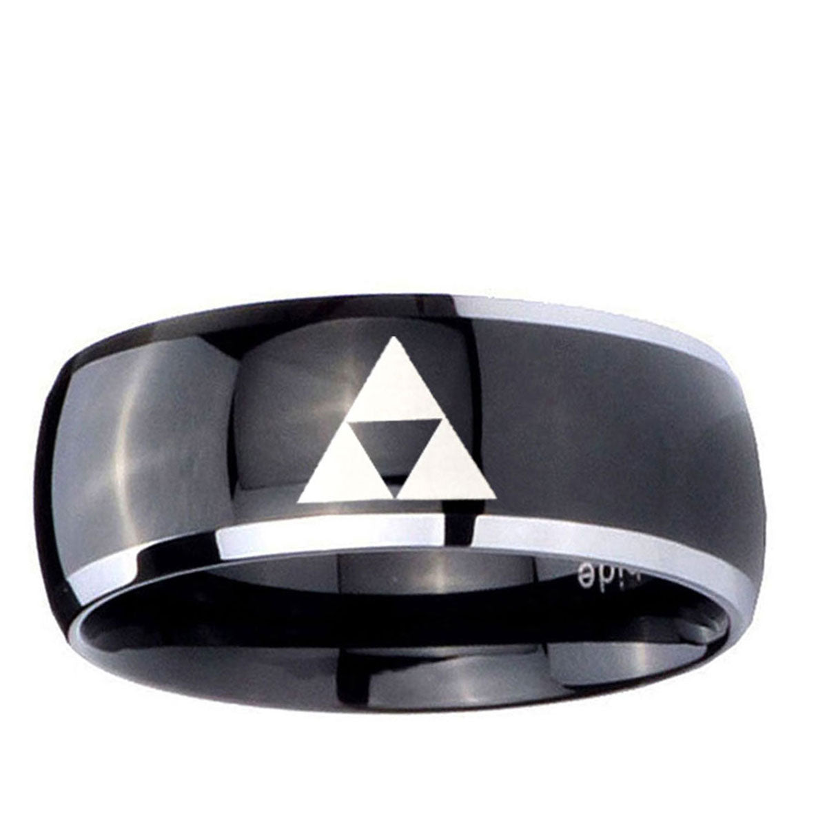 Celebrate with the 10mm Zelda Triforce Dome Glossy Black 2 Tone Tungsten Wedding Bands Ring. This glossy black and 2-tone dome ring with Zelda Triforce design is perfect for weddings.