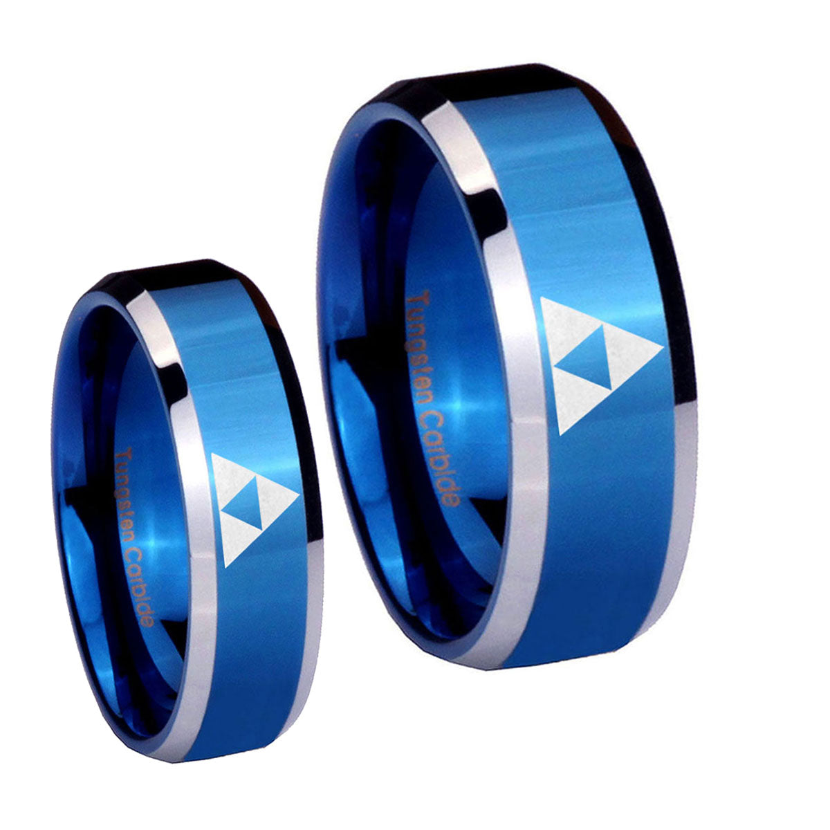 His Hers Zelda Triforce Beveled Blue 2 Tone Tungsten Men's Engagement Band Set