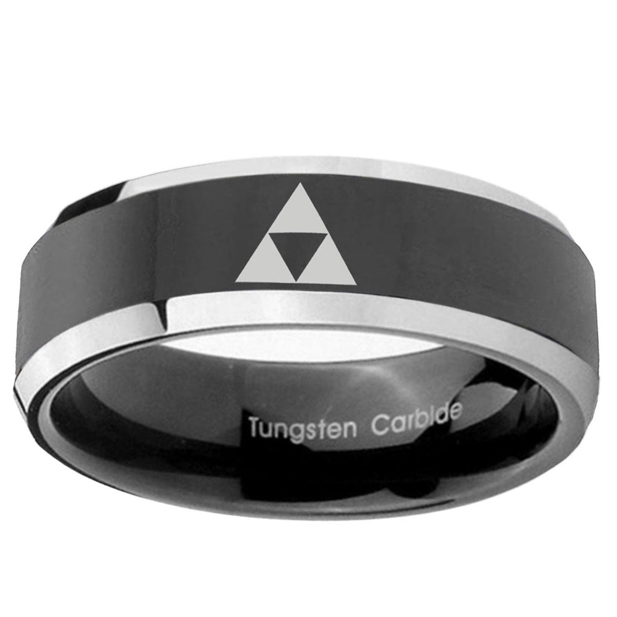 Style the 10mm Zelda Triforce Beveled Edges Glossy Black 2 Tone Tungsten Rings for Men. This glossy black and 2-tone tungsten ring with Zelda Triforce design is perfect for men.