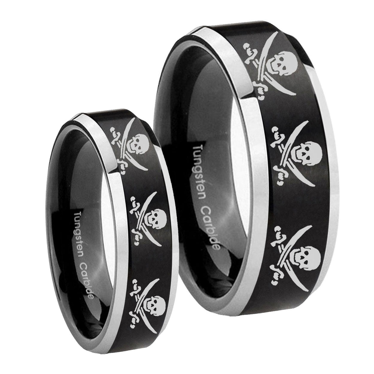 His Hers Multiple Skull Pirate Beveled Brush Black 2 Tone Tungsten Engagement Ring Set