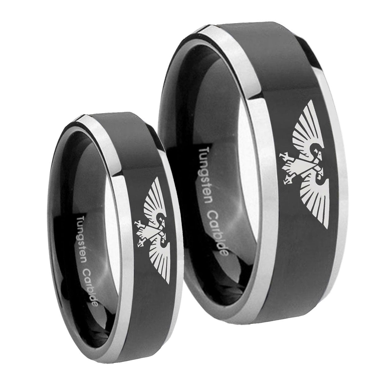 His Hers Aquila Beveled Edges Glossy Black 2 Tone Tungsten Mens Promise Ring Set