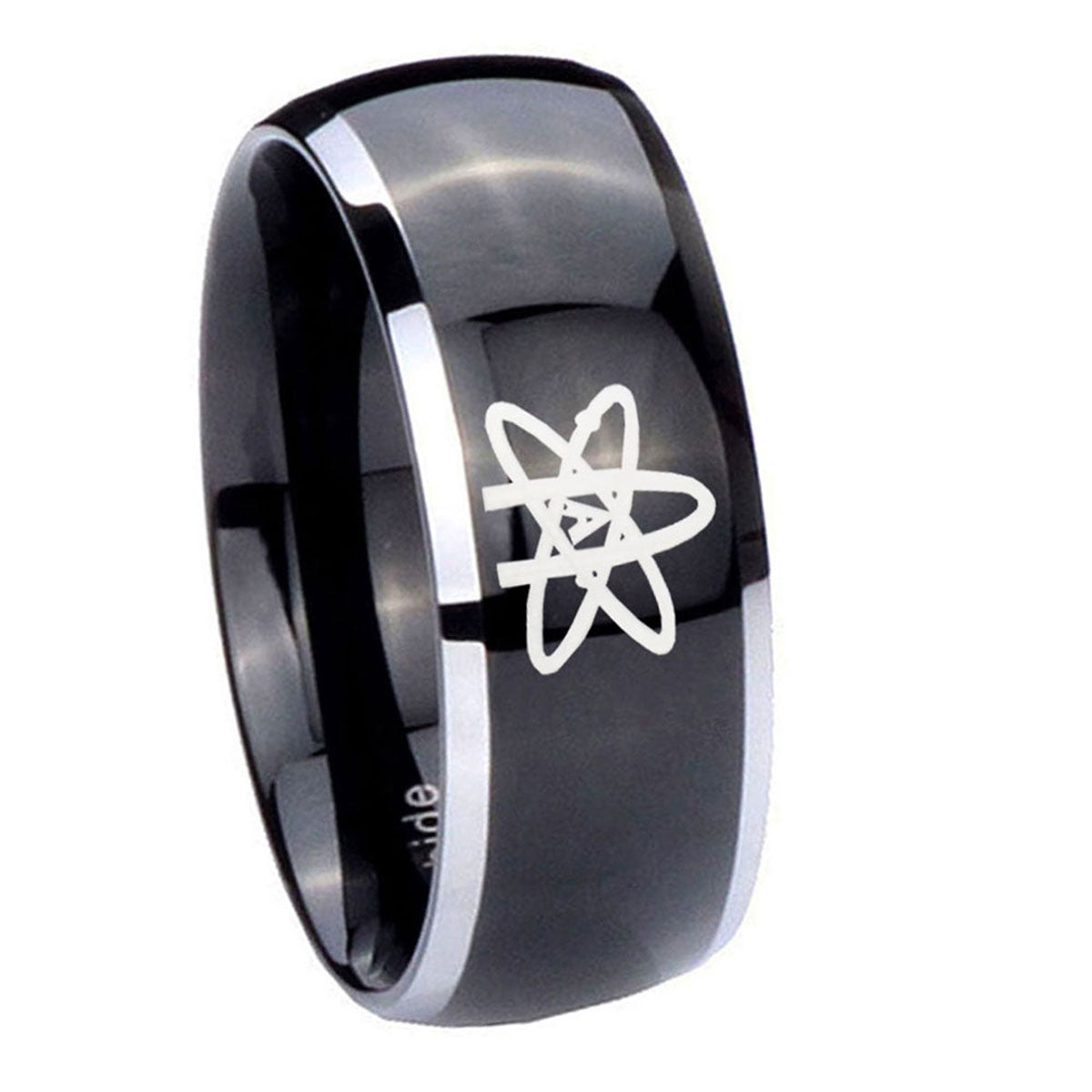 Customize the 10mm American Atheist Dome Glossy Black 2 Tone Tungsten Custom Ring for Men. This glossy black and 2-tone dome ring with American Atheist design is ideal for personalization.