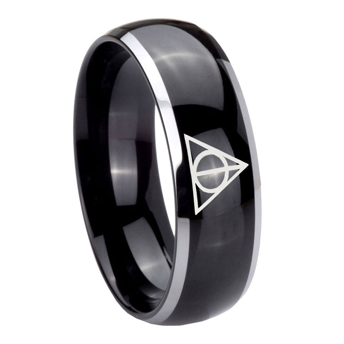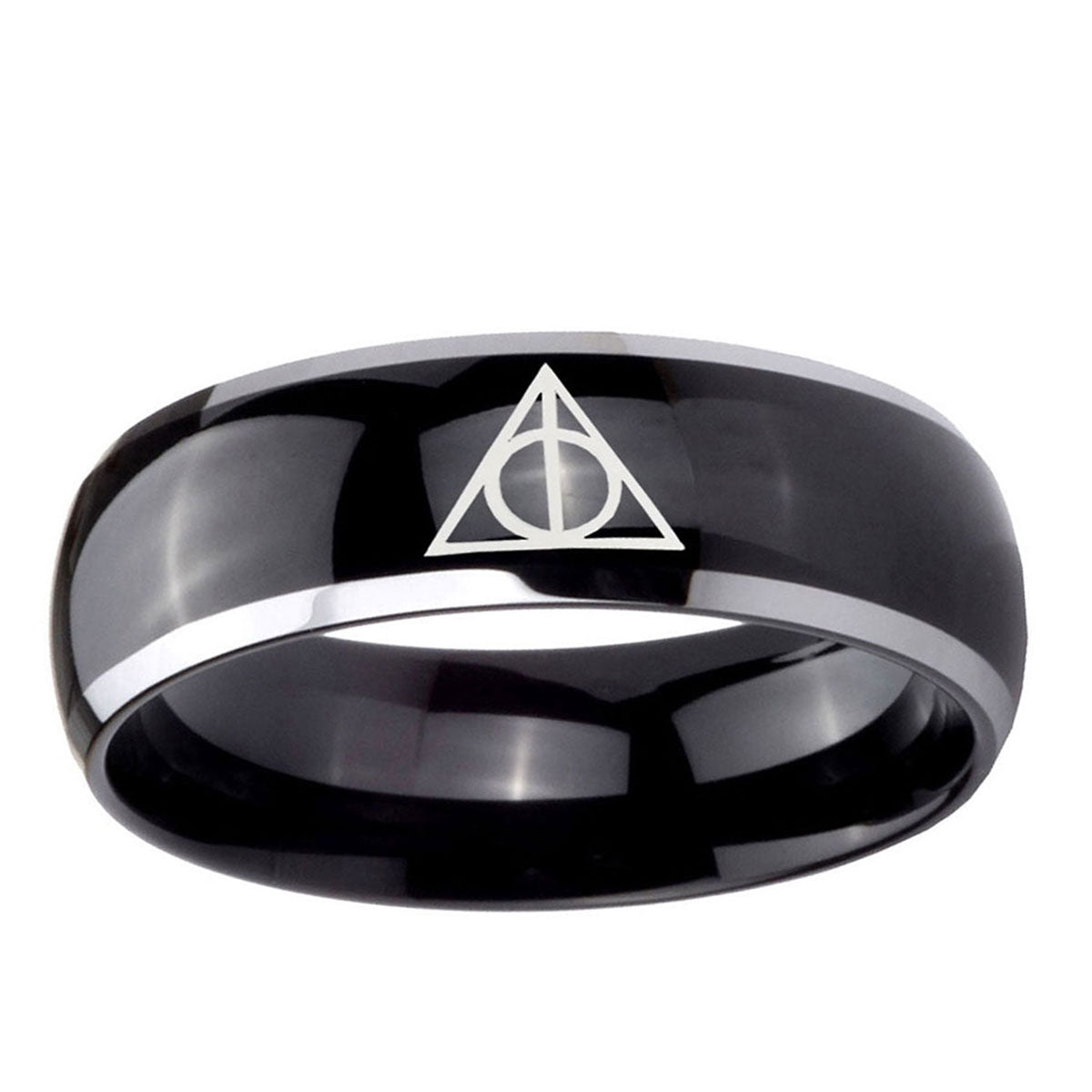 Style the 10mm Deathly Hallows Dome Glossy Black 2 Tone Tungsten Carbide Rings for Men. This glossy black and 2-tone dome ring with Deathly Hallows design is perfect for men.