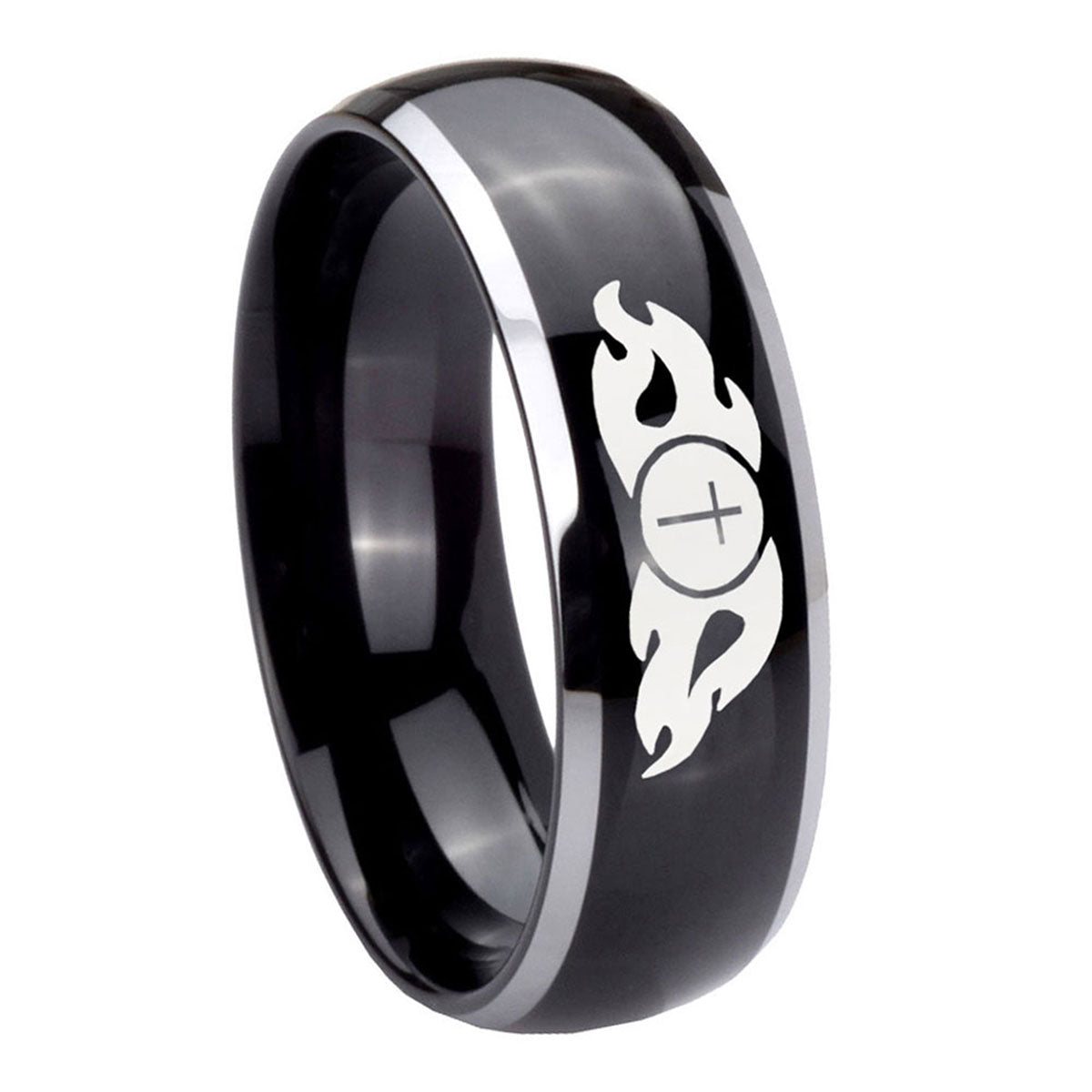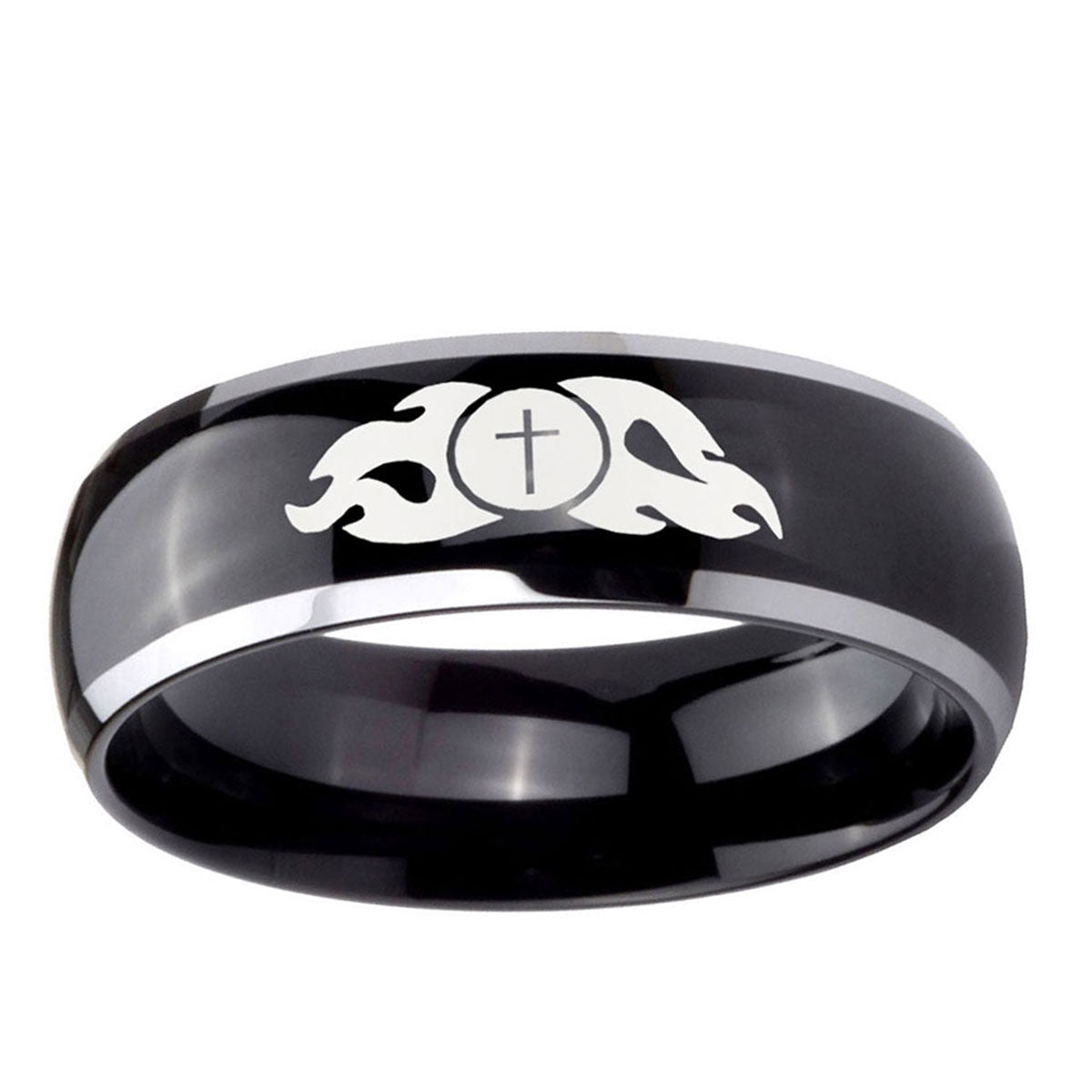 Celebrate with the 10mm Flamed Cross Dome Glossy Black 2 Tone Tungsten Carbide Wedding Bands Ring. This glossy black and 2-tone dome ring with Flamed Cross design is perfect for weddings.