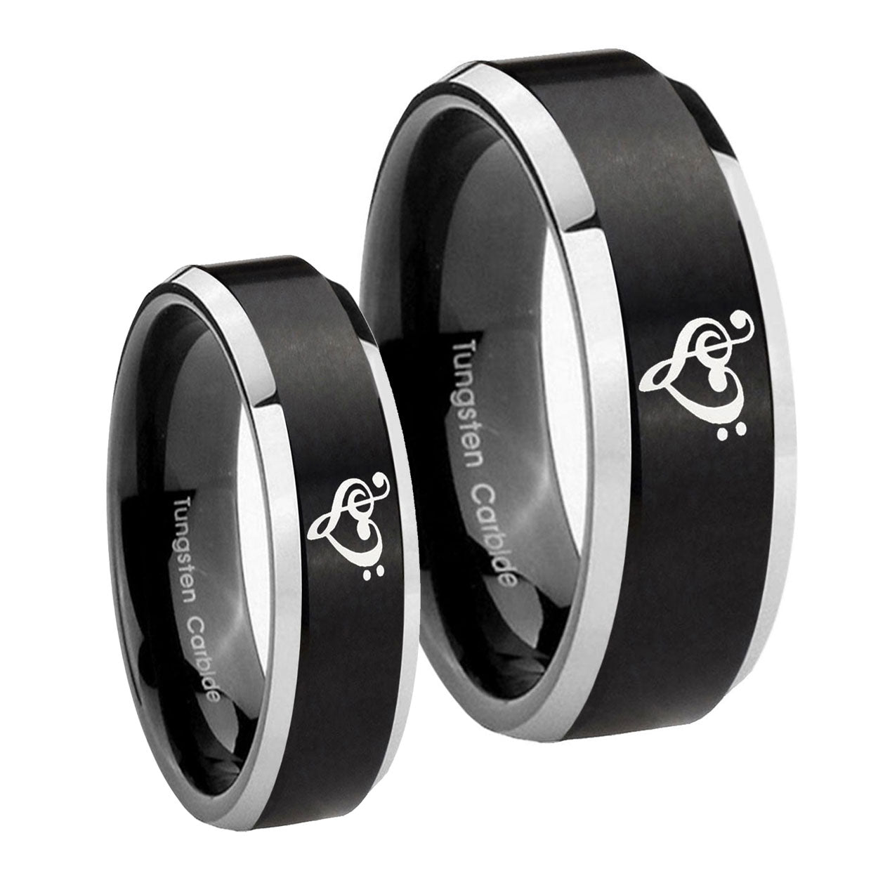 His Hers Music & Heart Beveled Brush Black 2 Tone Tungsten Mens Ring Set