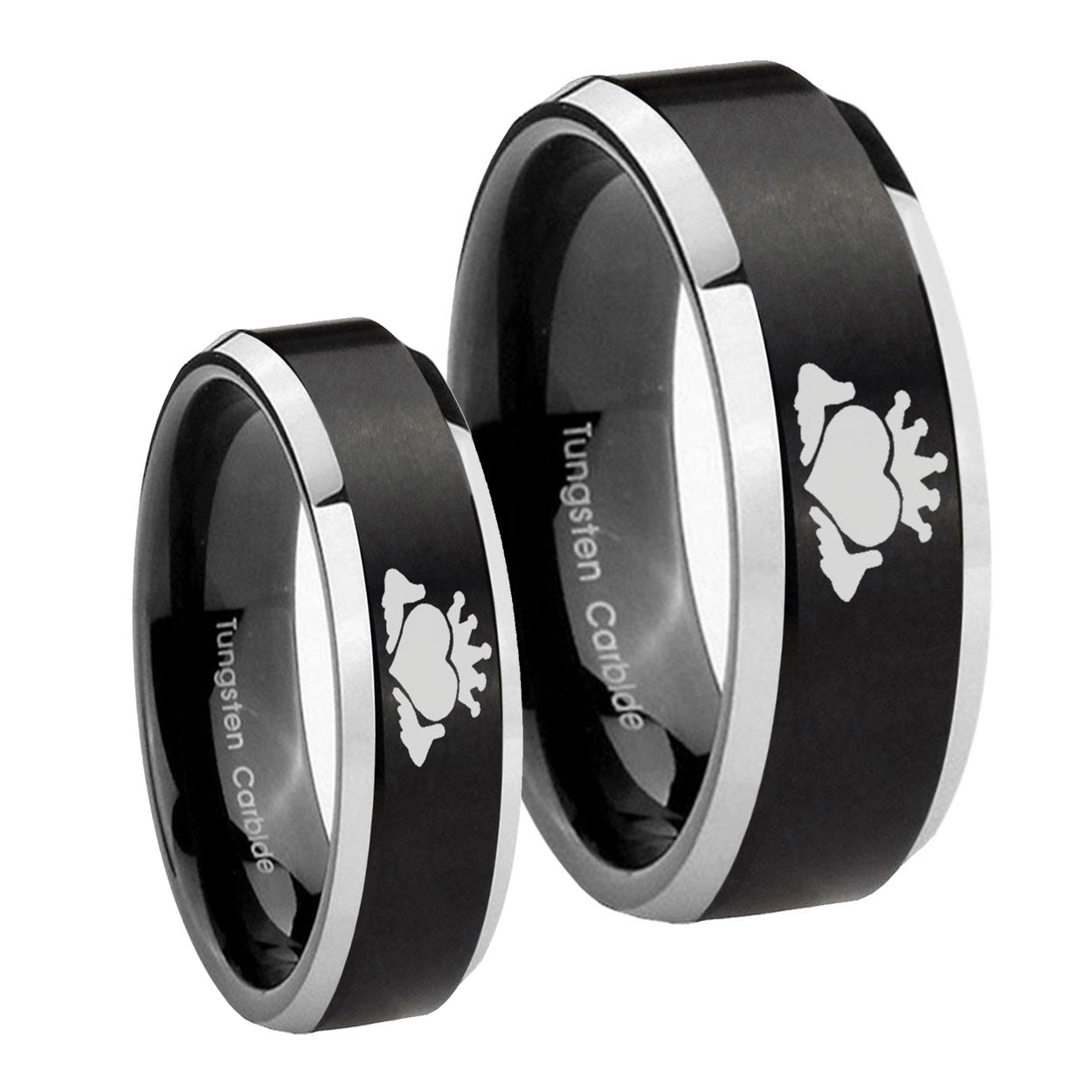 His Hers Claddagh Design Beveled Brush Black 2 Tone Tungsten Men's Ring Set