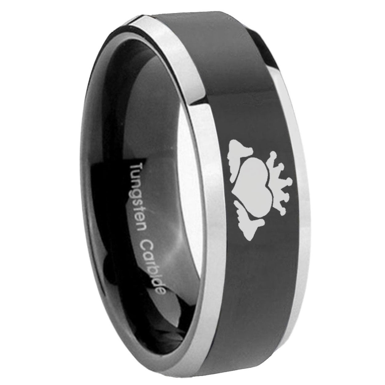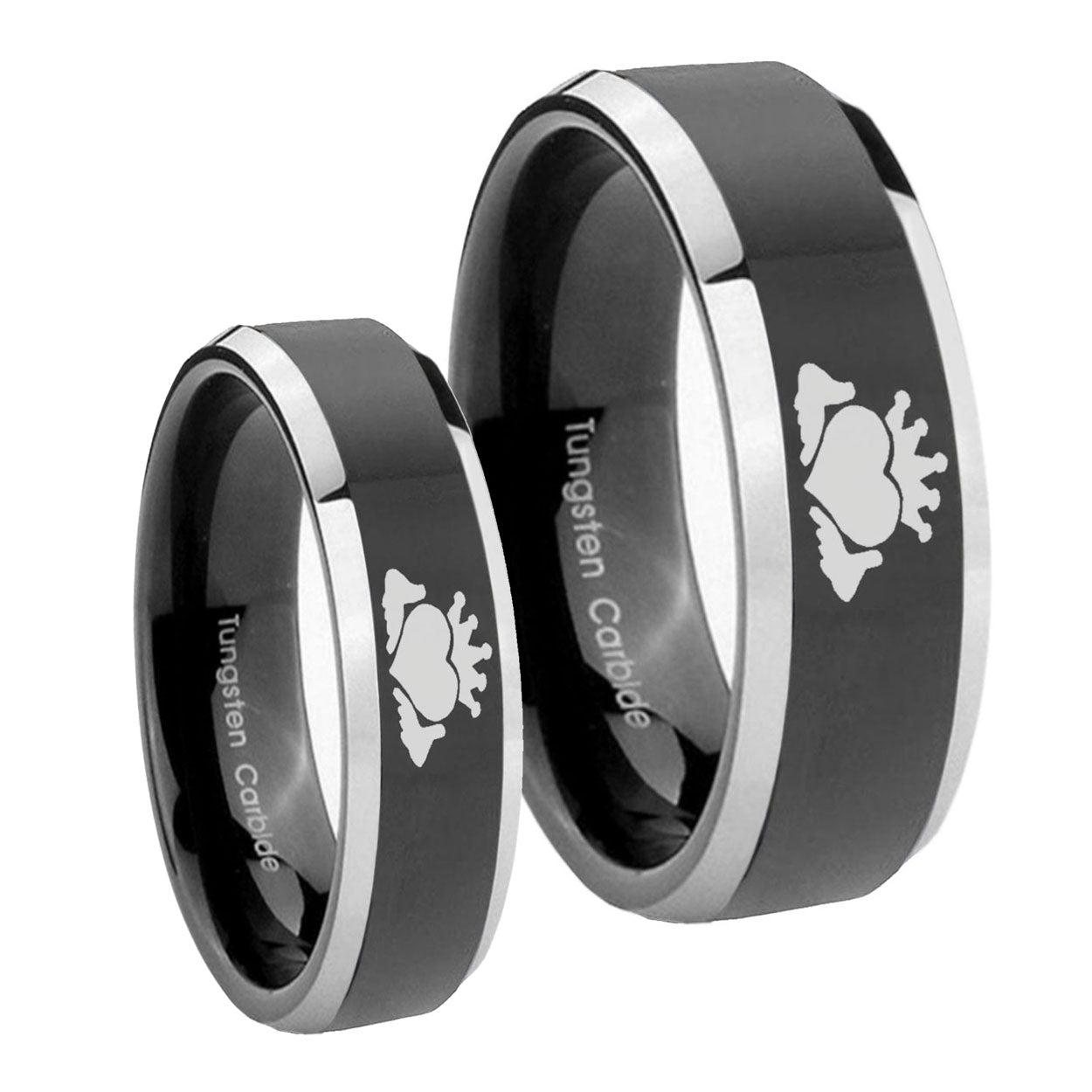 His Hers Claddagh Design Beveled Glossy Black 2 Tone Tungsten Engraving Ring Set