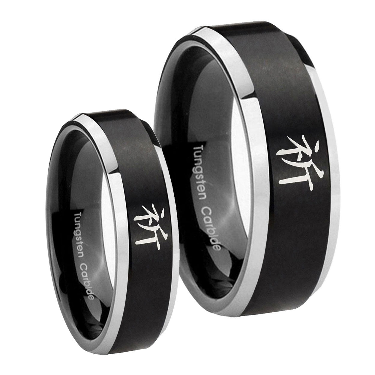His Hers Kanji Prayer Beveled Brush Black 2 Tone Tungsten Men's Ring Set
