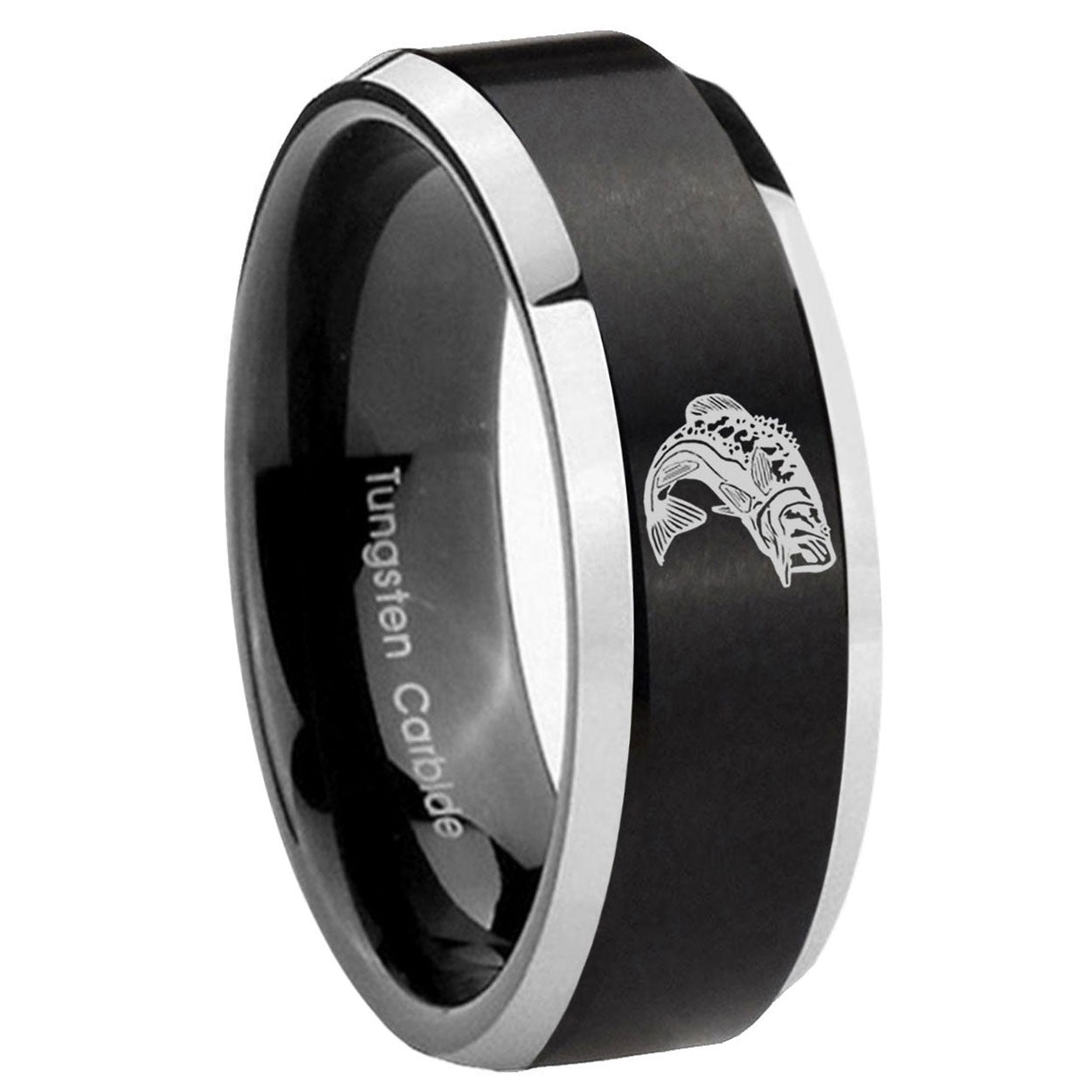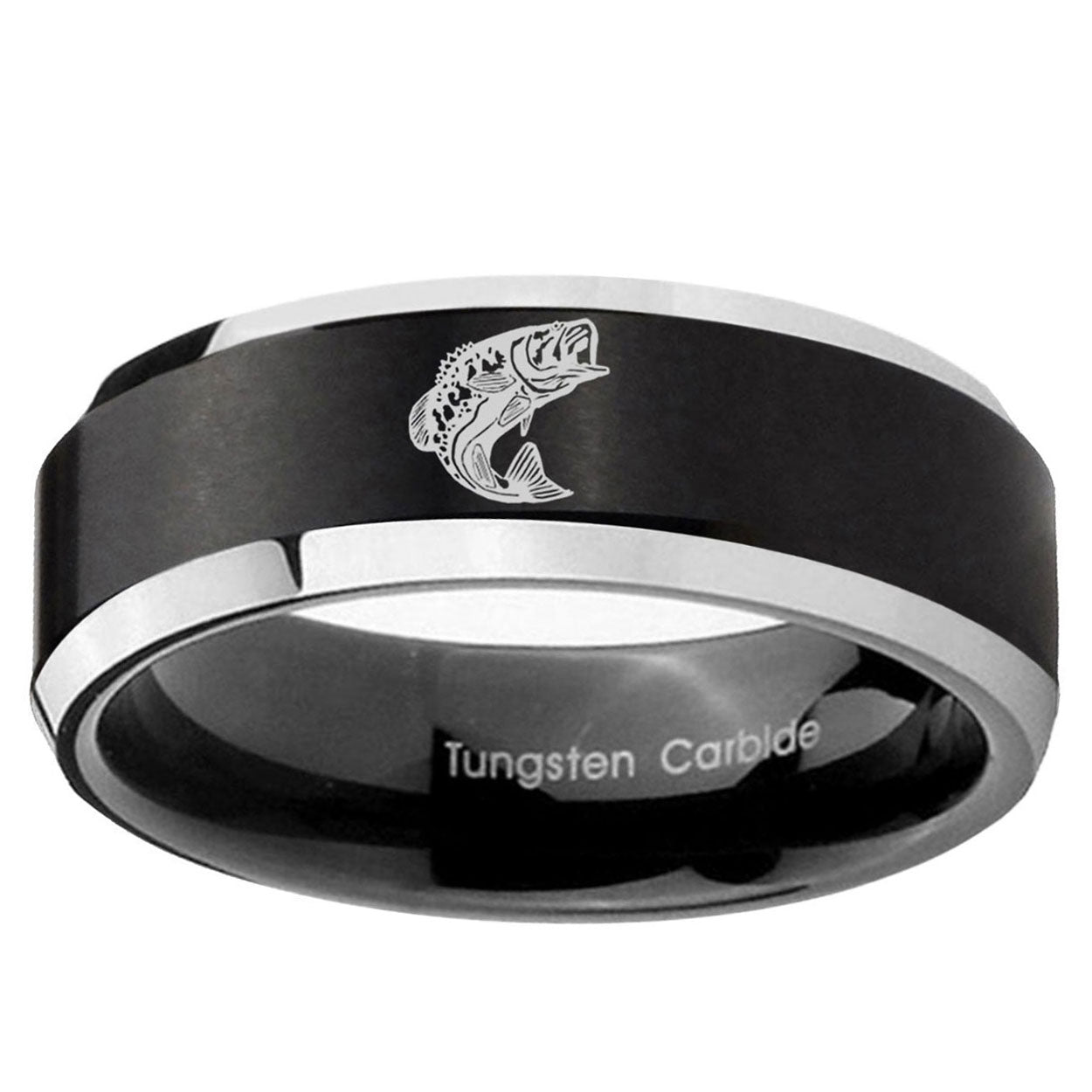 Intruding 5, 8mm Fishing Beveled Edges Brush Black 2 Tone Tungsten Mens Bands Ring . Offer in both 5mm and 8mm band width brushed black plated 2 tone finished from size 4 to 14