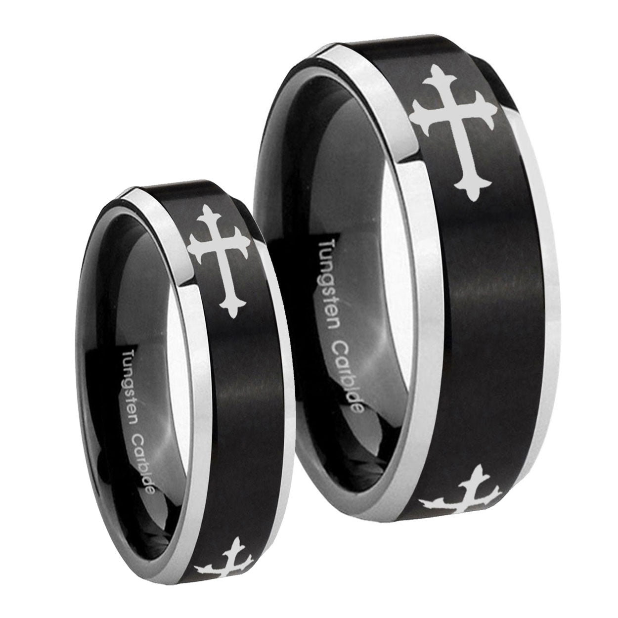 His Hers Christian Cross Religious Beveled Brush Black 2 Tone Tungsten Men's Ring Set