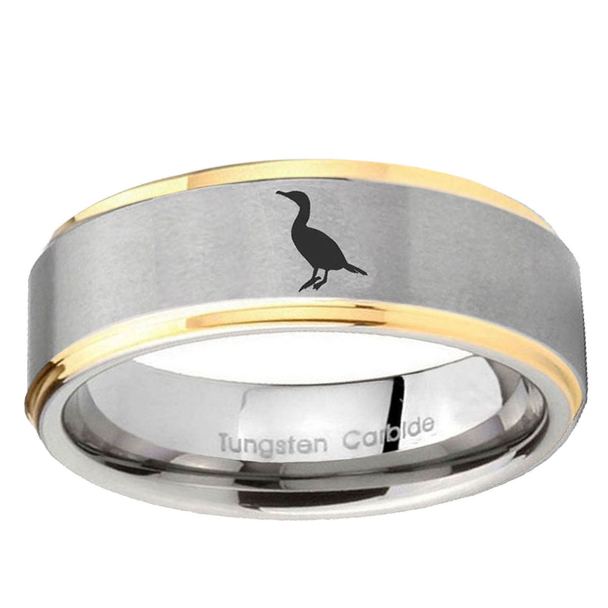 Celebrate with the 10mm Cormorant Step Edges Gold 2 Tone Tungsten Carbide Bands Ring. This gold and 2-tone tungsten ring with Cormorant design is ideal for weddings.