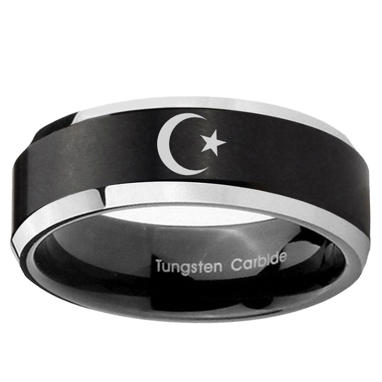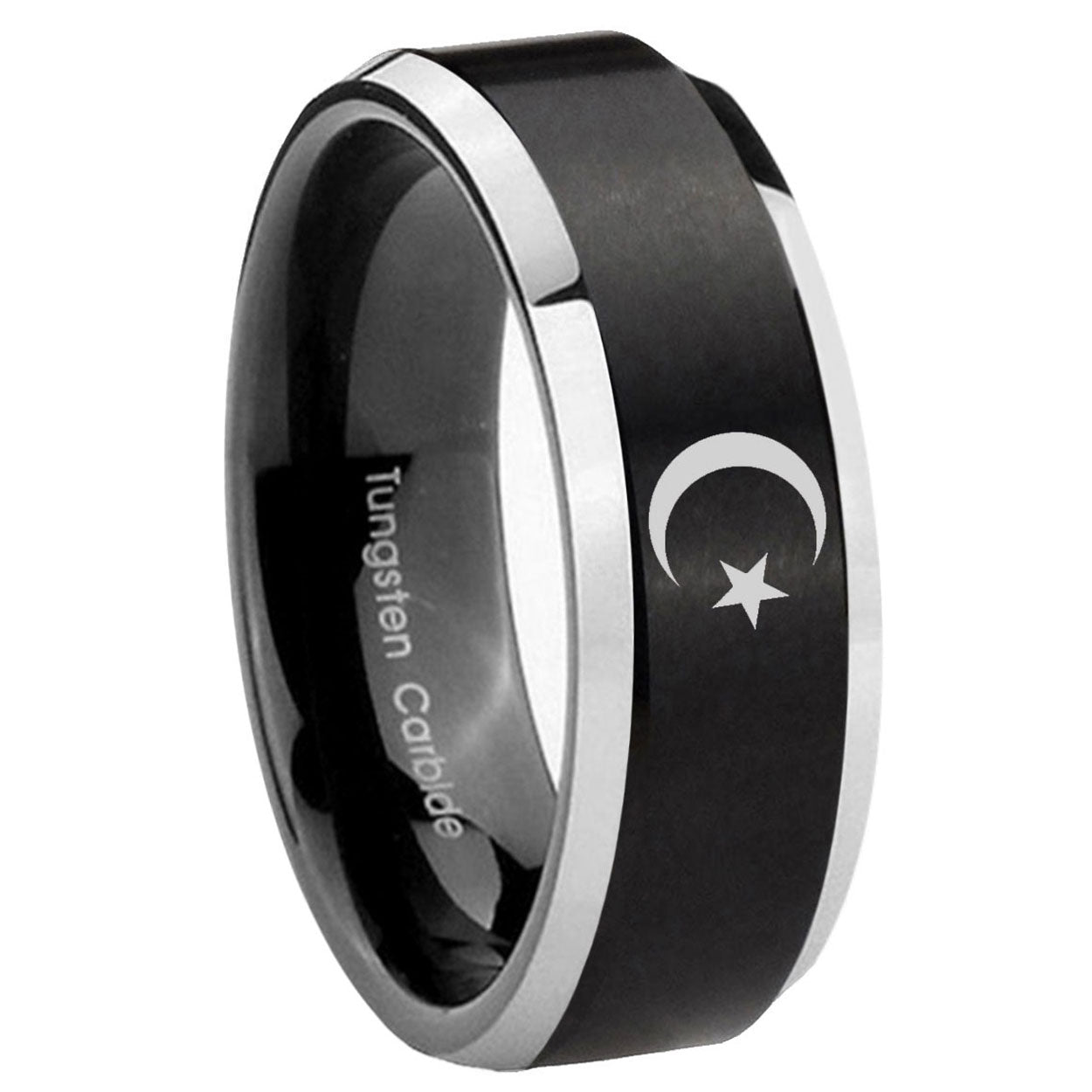Personalize the 10mm Crescent Moon Stars Beveled Brush Black 2 Tone Tungsten Mens Ring Engraved. This brushed black and 2-tone ring with Crescent Moon Stars design is perfect for custom engravings.