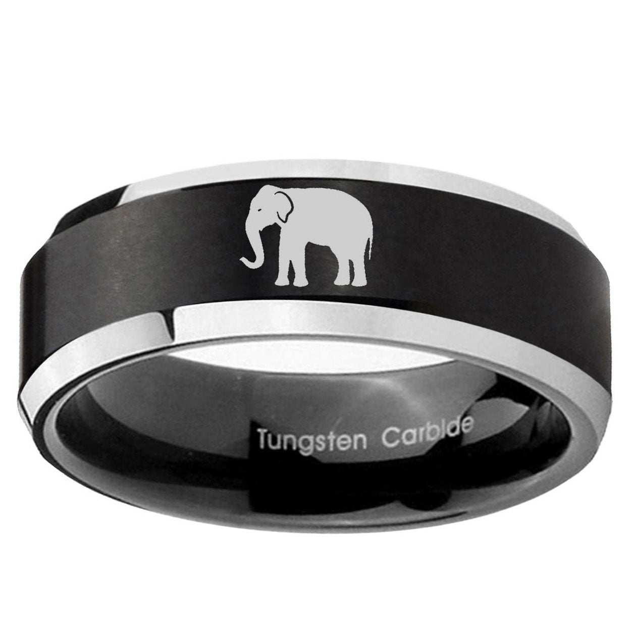 10mm Elephant Beveled Brush Black 2 Tone Tungsten Mens Ring Engraved