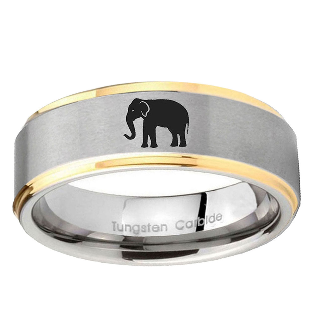 Celebrate with the 10mm Elephant Step Edges Gold 2 Tone Tungsten Carbide Bands Ring. This gold and 2-tone tungsten ring with Elephant design is ideal for weddings.