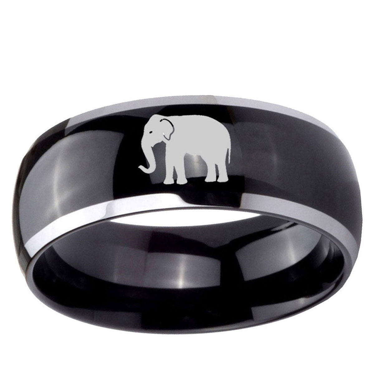 Personalize the 10mm Elephant Dome Glossy Black 2 Tone Tungsten Carbide Engraved Ring. This glossy black and 2-tone dome ring with Elephant design is perfect for custom engravings.