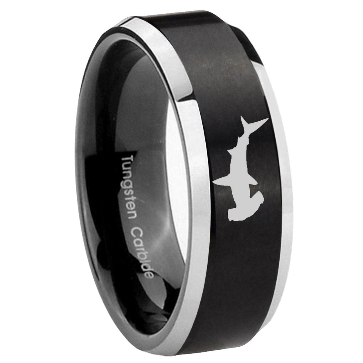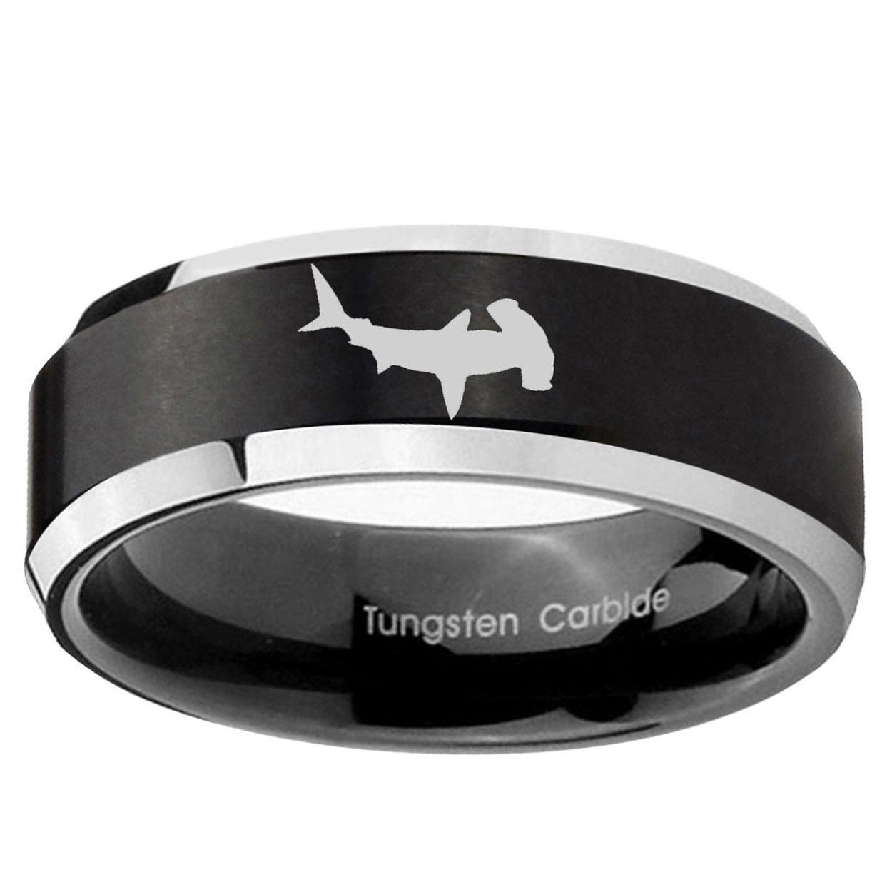 Personalize the 10mm Hammerhead Shark Beveled Brush Black 2 Tone Tungsten Mens Ring Engraved. This brushed black and 2-tone ring with Hammerhead Shark design is perfect for custom engravings.