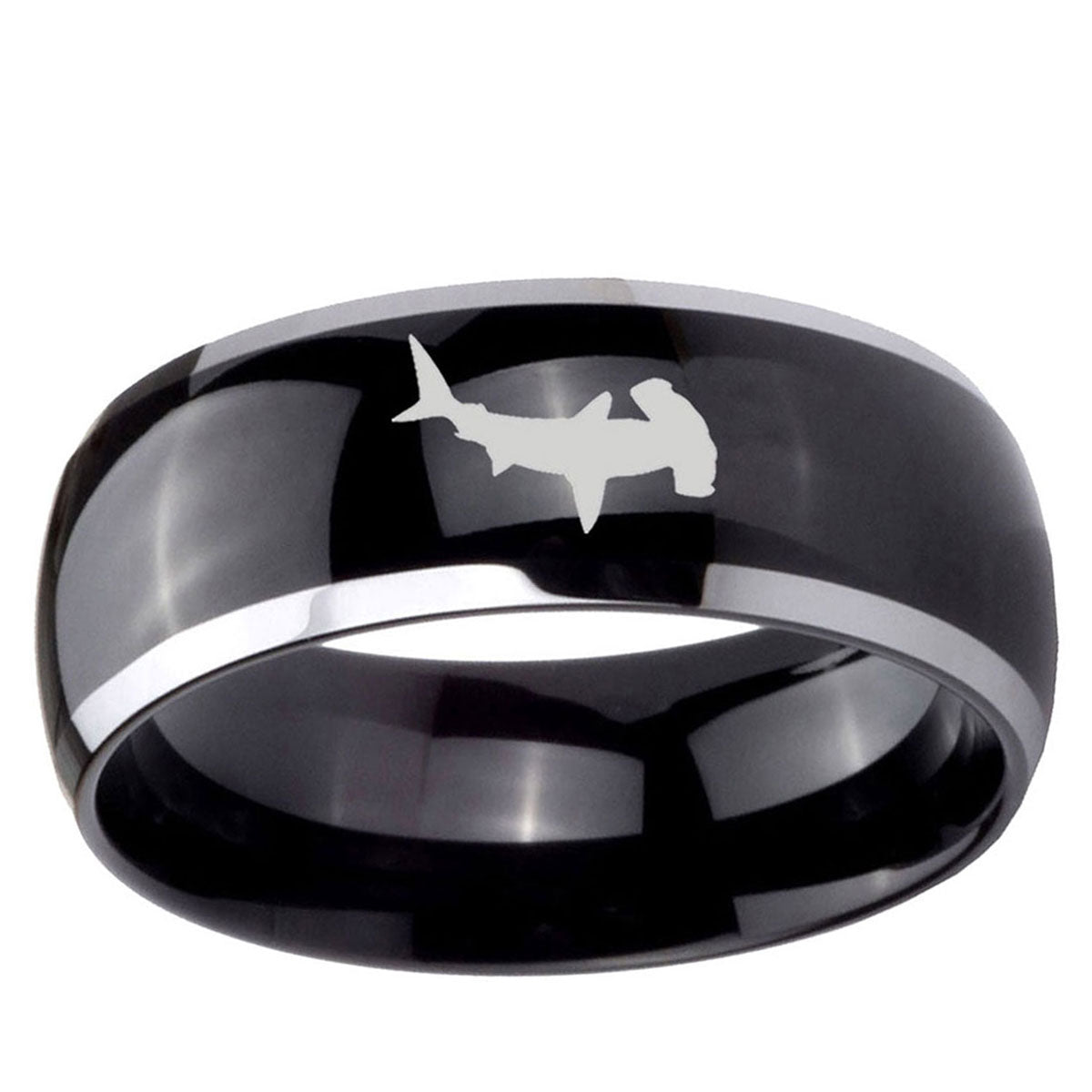 10mm Hammerhead Shark Dome Glossy Black 2 Tone Tungsten Carbide Engraved Ring