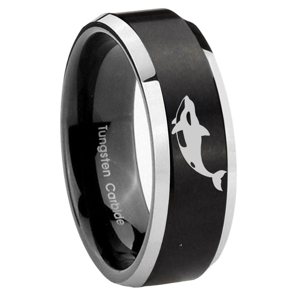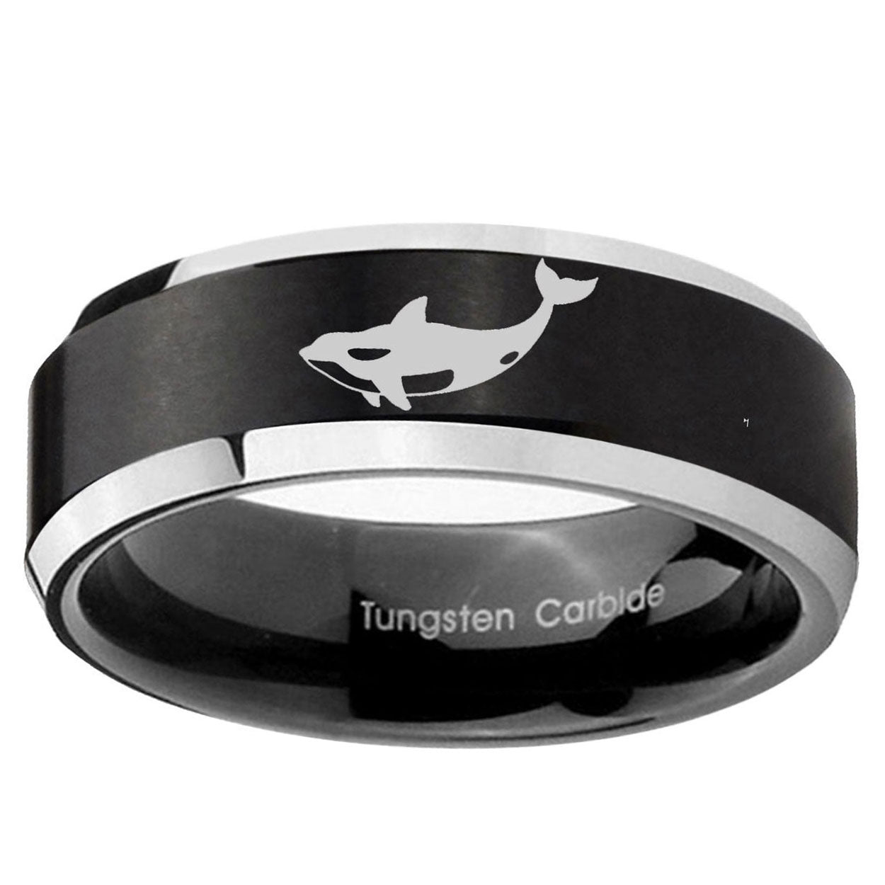 Personalize the 10mm Keller Whale Beveled Brush Black 2 Tone Tungsten Mens Ring Engraved. This brushed black and 2-tone tungsten ring with Keller Whale design is perfect for custom engravings.