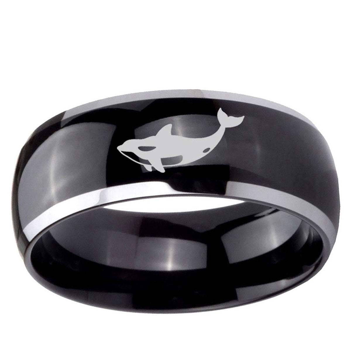Personalize the 10mm Keller Whale Dome Glossy Black 2 Tone Tungsten Carbide Engraved Ring. This glossy black and 2-tone dome ring with Keller Whale design is perfect for custom engravings.