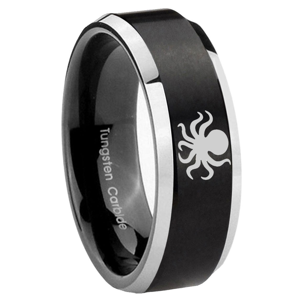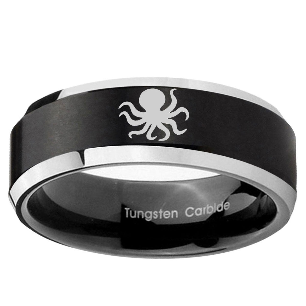 Personalize the 10mm Octopus Beveled Brush Black 2 Tone Tungsten Mens Ring Engraved. This brushed black and 2-tone tungsten ring with Octopus design is perfect for custom engravings.