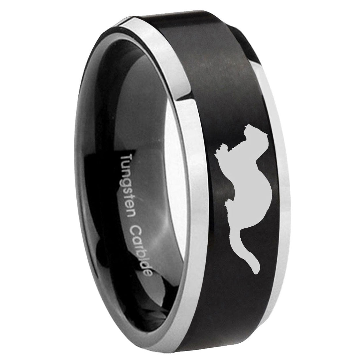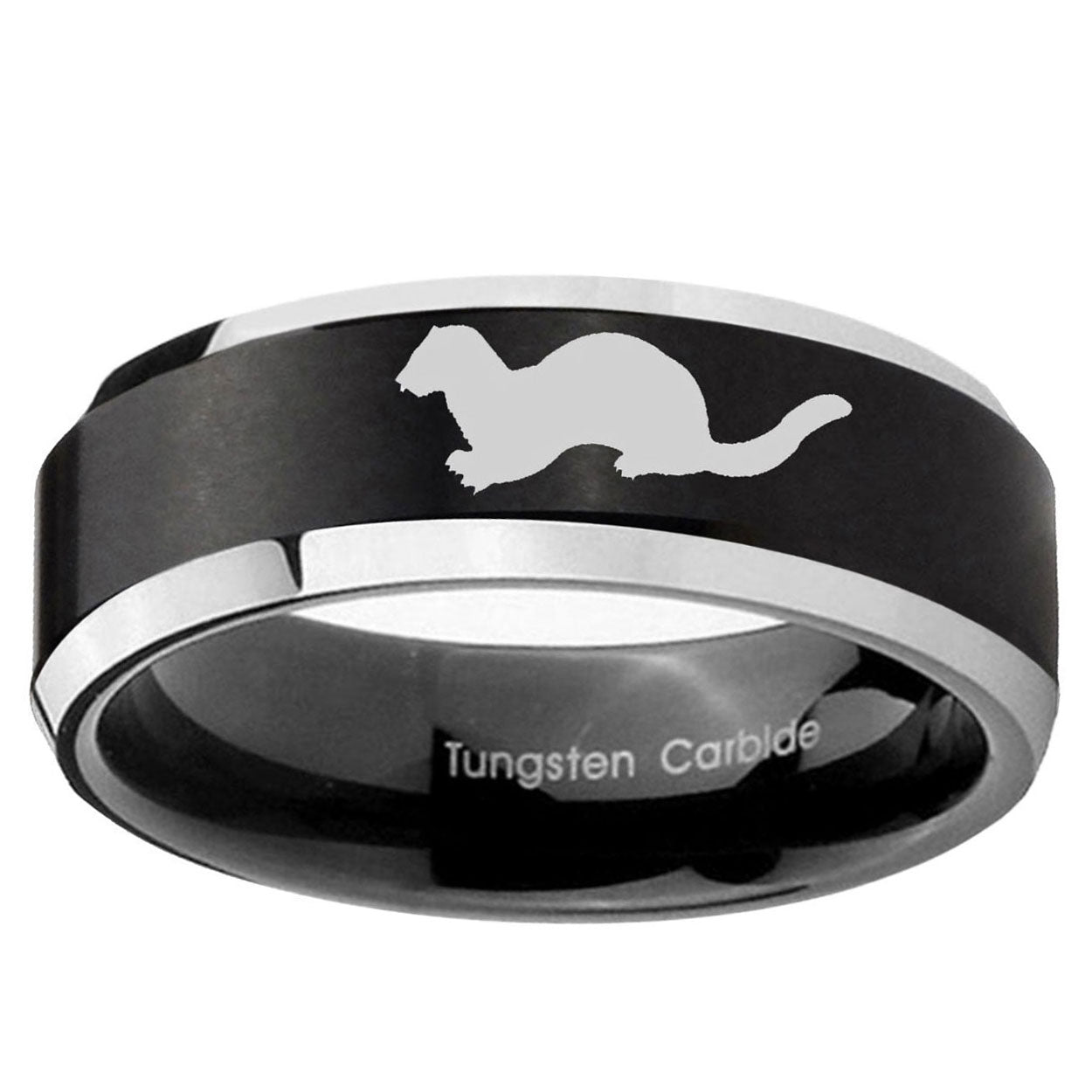 Personalize the 10mm Otter Beveled Brush Black 2 Tone Tungsten Mens Ring Engraved. This brushed black and 2-tone tungsten ring with Otter design is perfect for custom engravings.