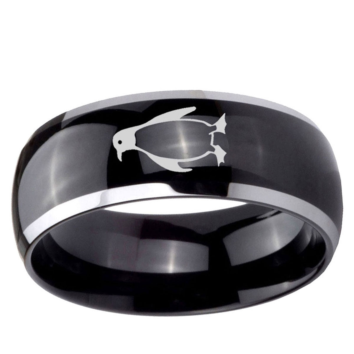 Personalize the 10mm Penguin Dome Glossy Black 2 Tone Tungsten Carbide Engraved Ring. This glossy black and 2-tone dome ring with Penguin design is perfect for custom engravings.