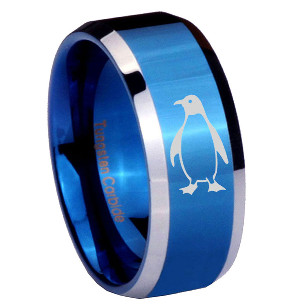 Propose with the 10mm Penguin Beveled Edges Blue 2 Tone Tungsten Men's Engagement Ring. This blue and black 2-tone tungsten ring with Penguin design is ideal for engagements.