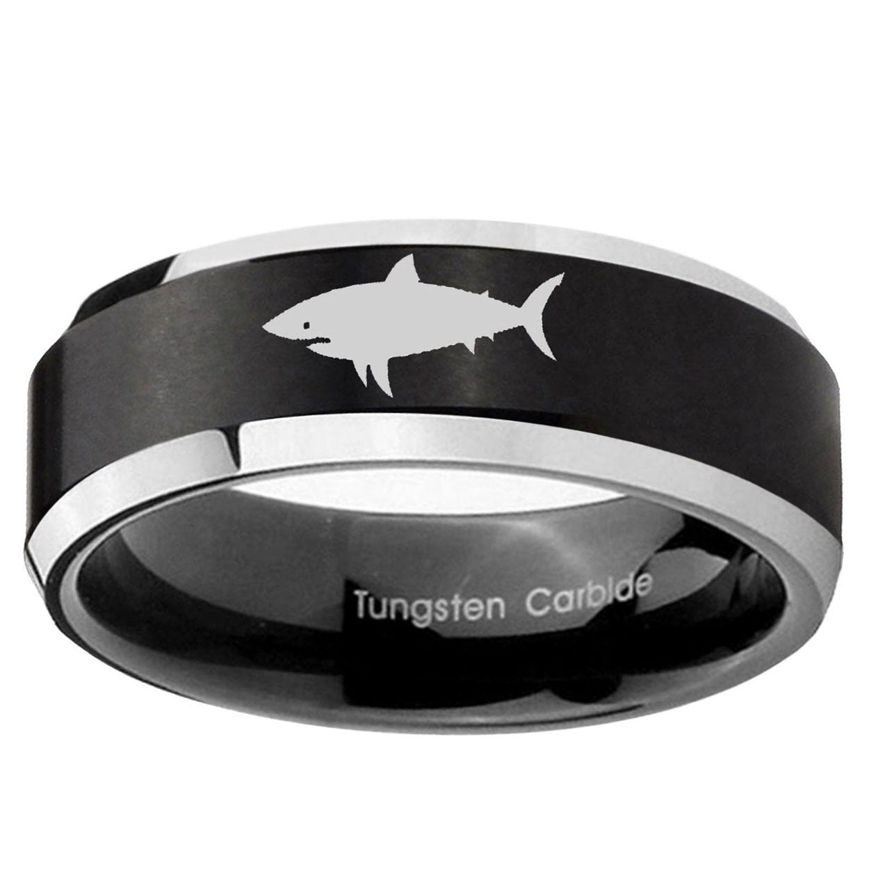 Personalize the 10mm Shark Beveled Brush Black 2 Tone Tungsten Mens Ring Engraved. This brushed black and 2-tone tungsten ring with Shark design is perfect for custom engravings.