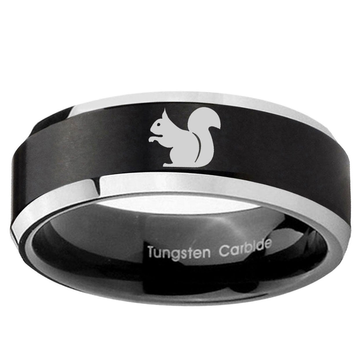 Personalize the 10mm Squirrel Beveled Brush Black 2 Tone Tungsten Mens Ring Engraved. This brushed black and 2-tone tungsten ring with Squirrel design is perfect for custom engravings.