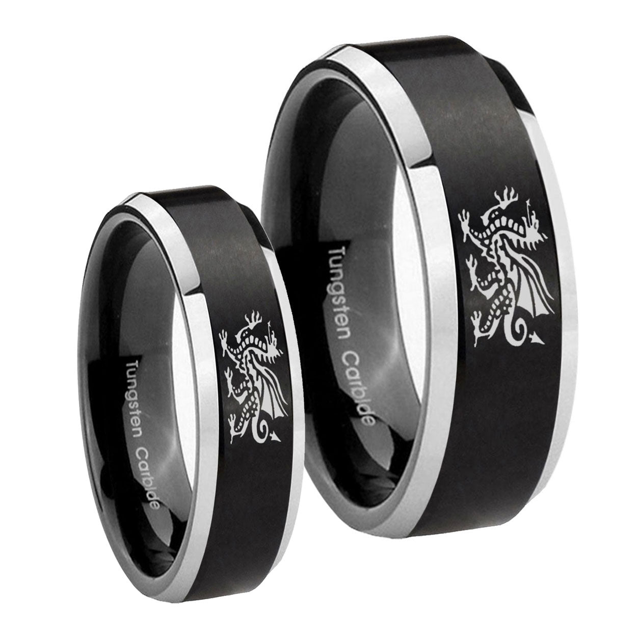 His Hers Dragon Beveled Edges Brush Black 2 Tone Tungsten Wedding Band Ring Set