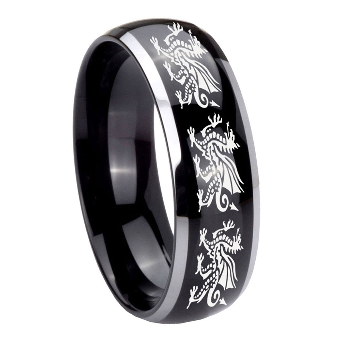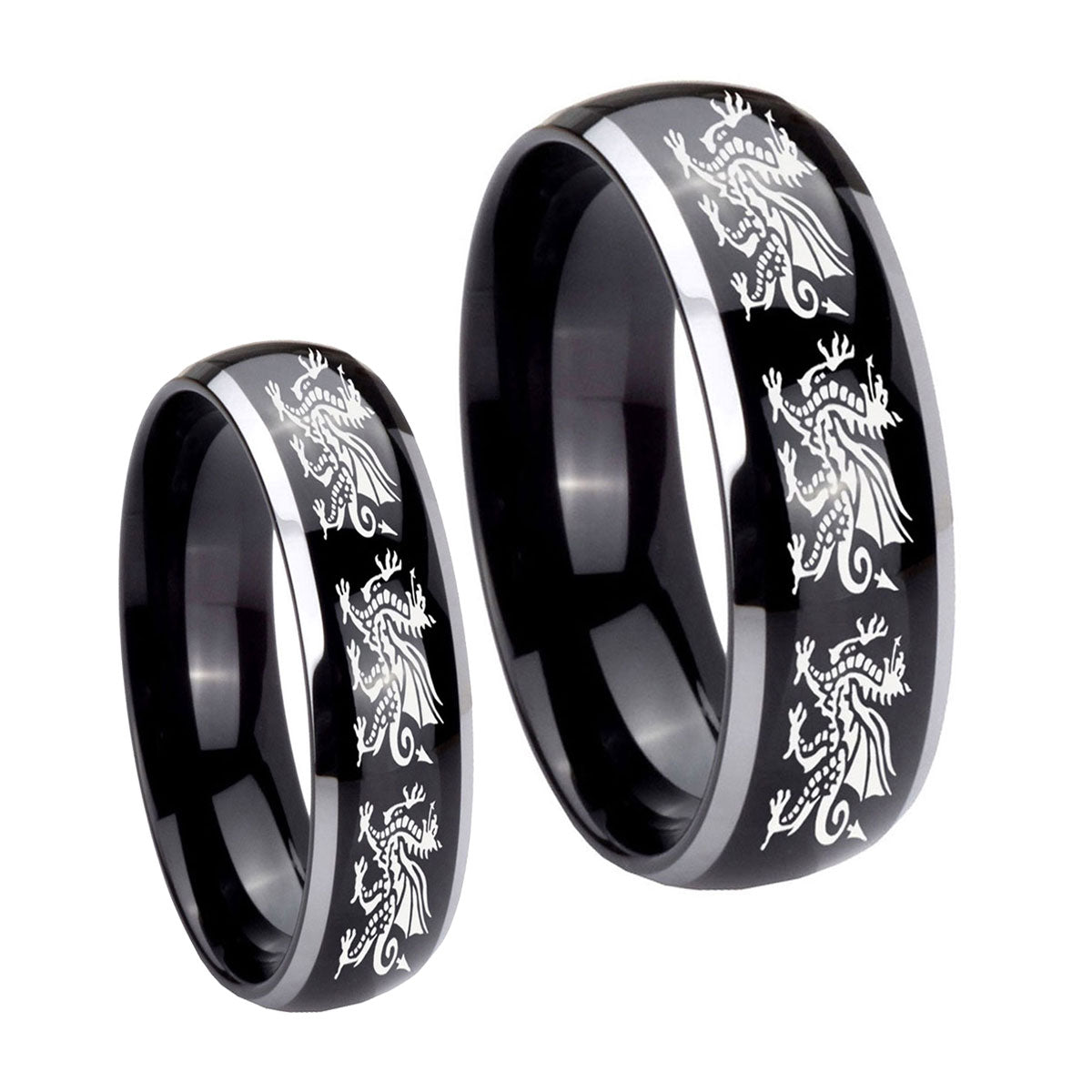 His Hers Multiple Dragon Dome Glossy Black 2 Tone Tungsten Engraving Ring Set