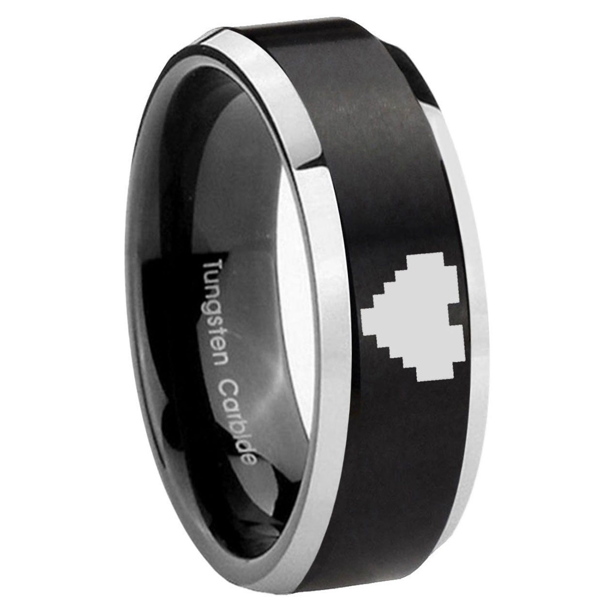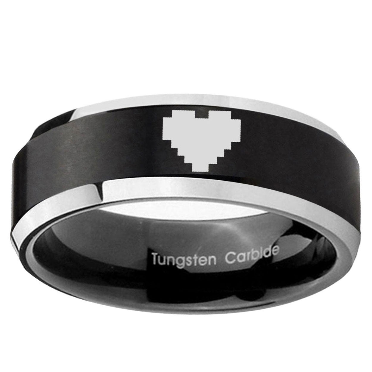 5, 8mm Bevel Brush Black 2 Tone Zelda Heart Tungsten Laser Engraved Ring