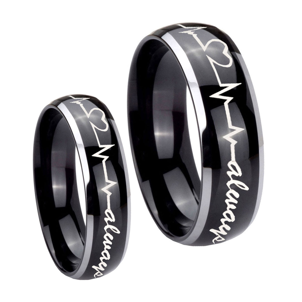 His Hers Heart Beat forever Heart always Dome Glossy Black 2 Tone Tungsten Men's Band Set