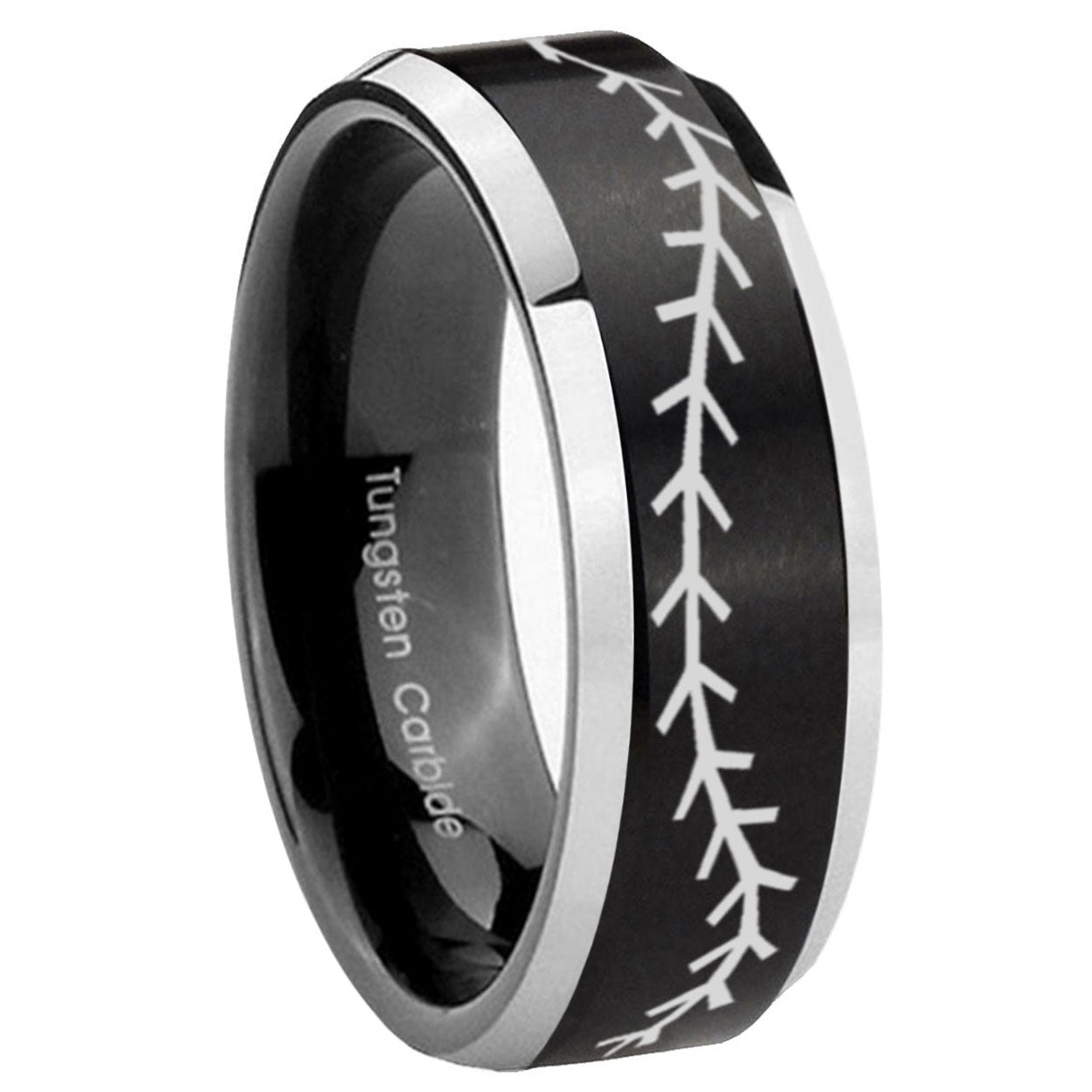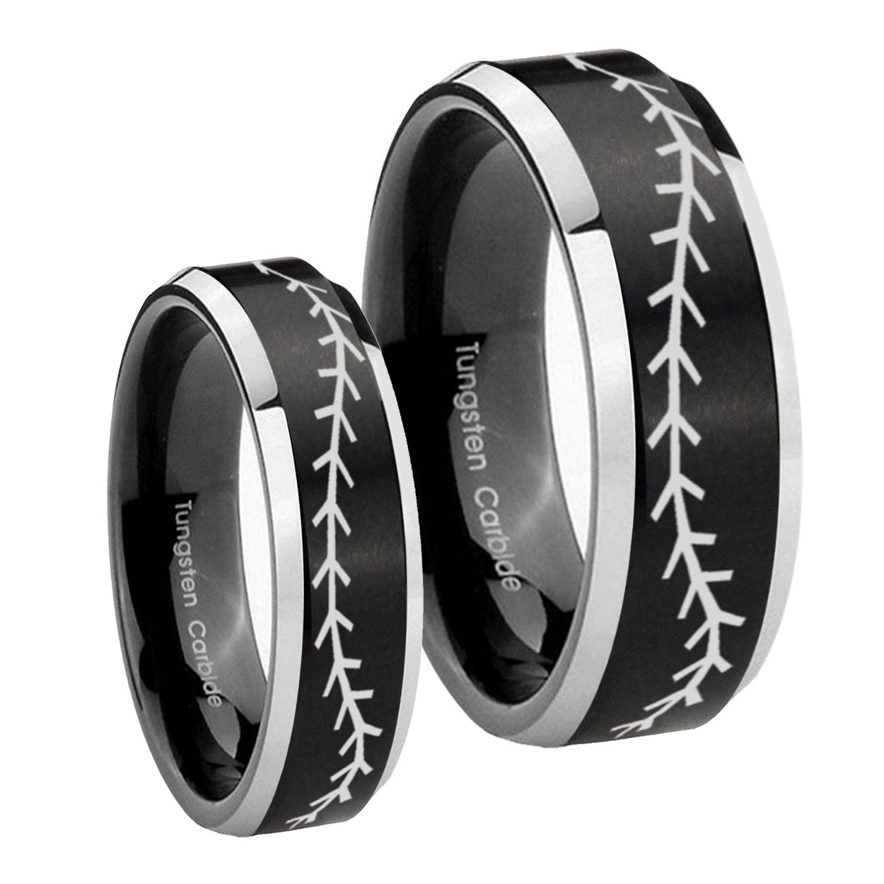 His Hers Baseball Stitch Beveled Brush Black 2 Tone Tungsten Men Ring Set