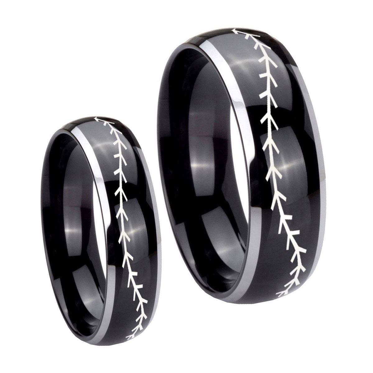 His Hers Baseball Stitch Dome Glossy Black 2 Tone Tungsten Men's Ring Set