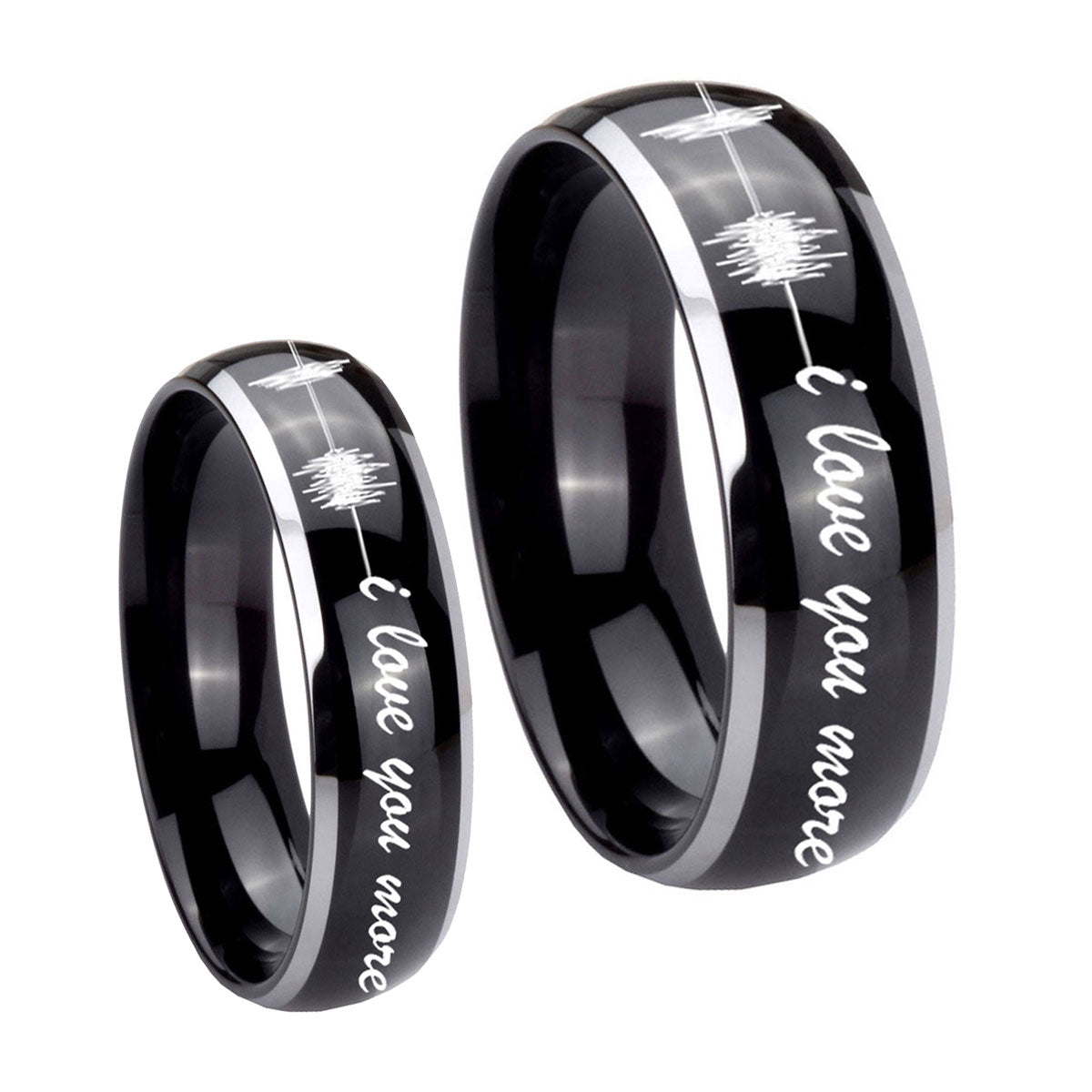 Celebrate with the His And Hers Sound Wave I love you more Dome Glossy Black 2 Tone Tungsten Men's Band Ring.