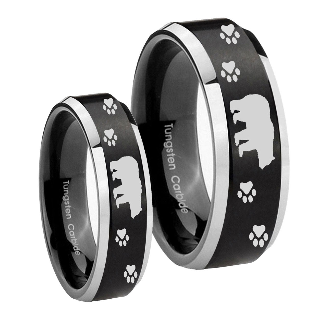 His Hers Bear and Paw Beveled Brush Black 2 Tone Tungsten Mens Promise Ring Set