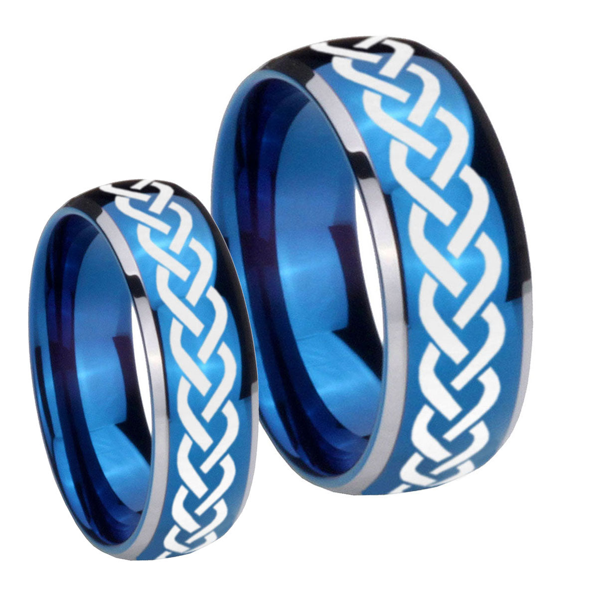 His Hers Laser Celtic Knot Dome Blue 2 Tone Tungsten Mens Engagement Band Set