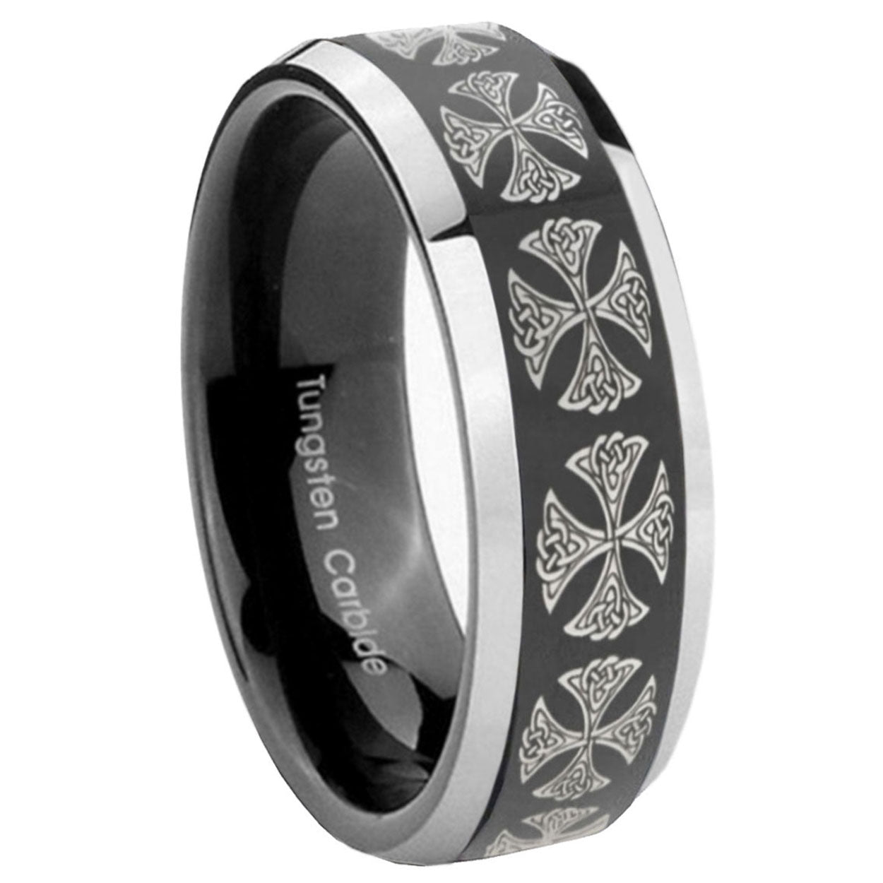 Propose with the 10mm Medieval Cross Beveled Glossy Black 2 Tone Tungsten Engagement Ring. This glossy black and 2-tone tungsten ring with Medieval Cross design is ideal for engagements.