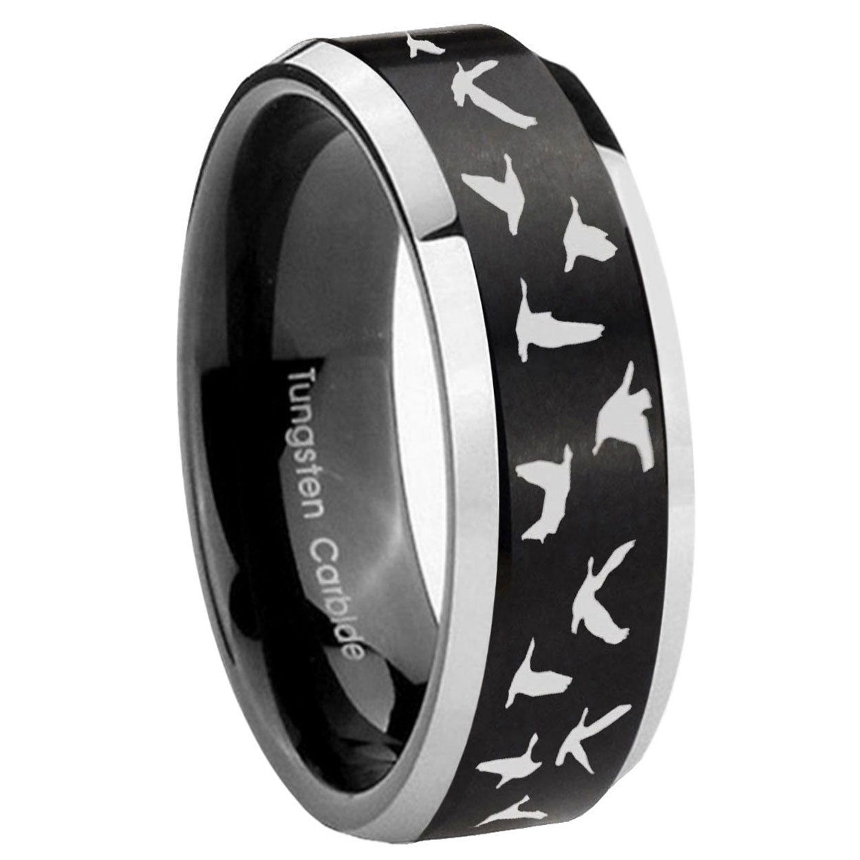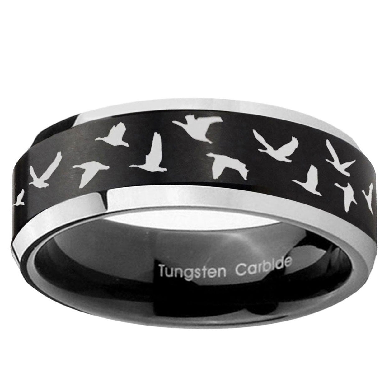 Intruding 5, 8mm Flying Geese Hunting Beveled Edges Brush Black 2 Tone Tungsten Mens Bands Ring . Offer in both 5mm and 8mm band width brushed black plated 2 tone finished from size 4 to 14